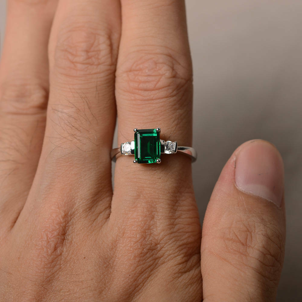 1.2ct Emerald Cut Green Emerald Engagement Ring 14k White Gold Finish Trilogy