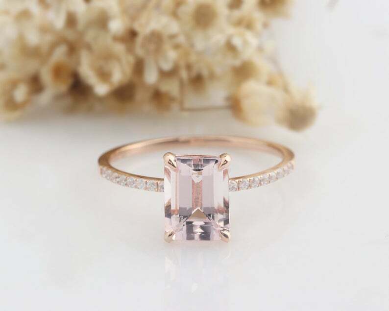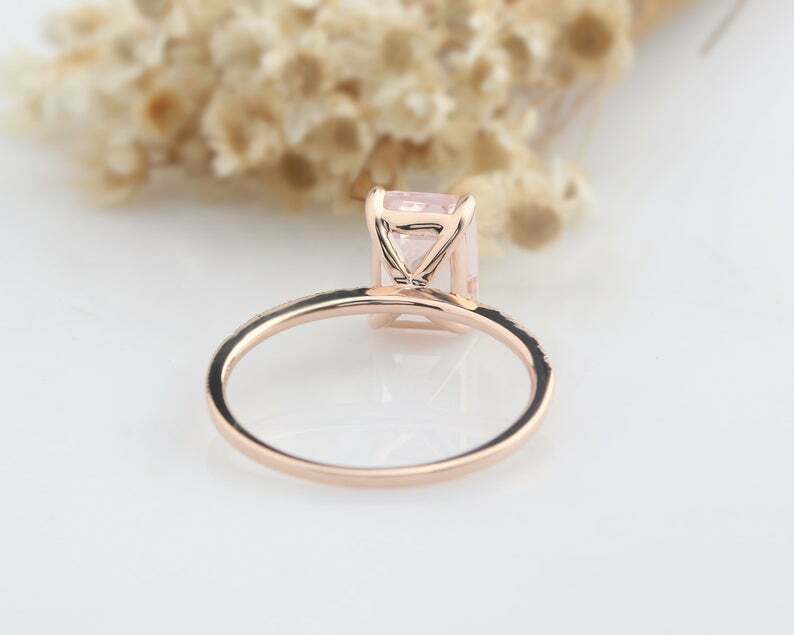 1.2ct Emerald Cut Peach Morganite Solitaire Ring 14k Rose Gold Over with Round Accent