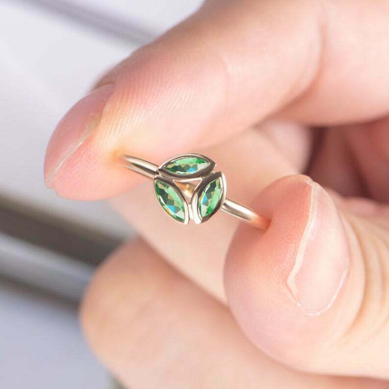 1.2ct Marquise Cut Green Emerald 3 Stone Leaf Design Ring 14k Yellow Gold Finish