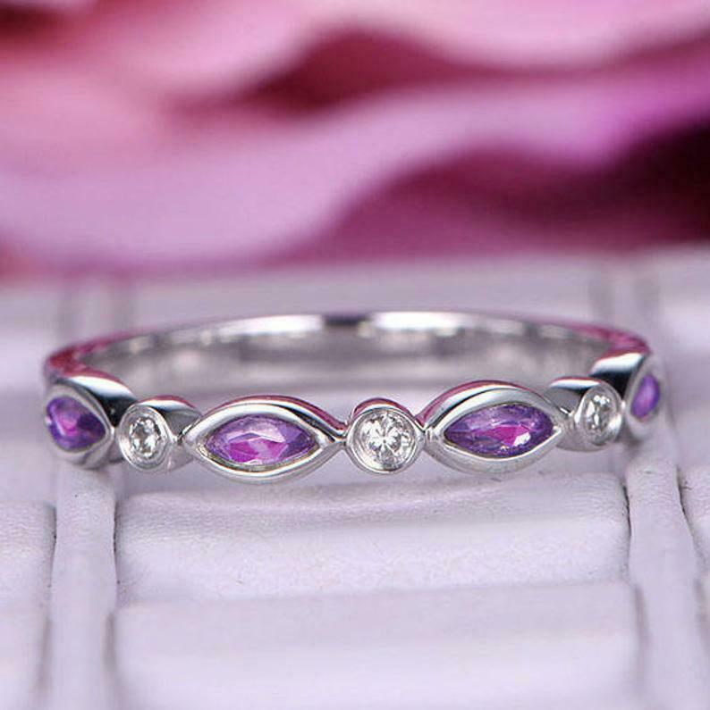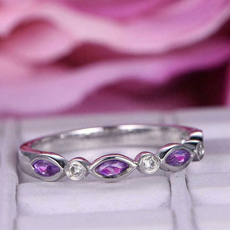 1.2ct Marquise Cut Purple Amethyst Wedding Band Half Eternity 14k White Gold Finish