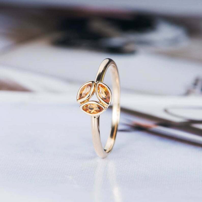 1.2ct Marquise Cut Yellow Citrine 3 Stone Leaf Design Ring 14k Yellow Gold Finish