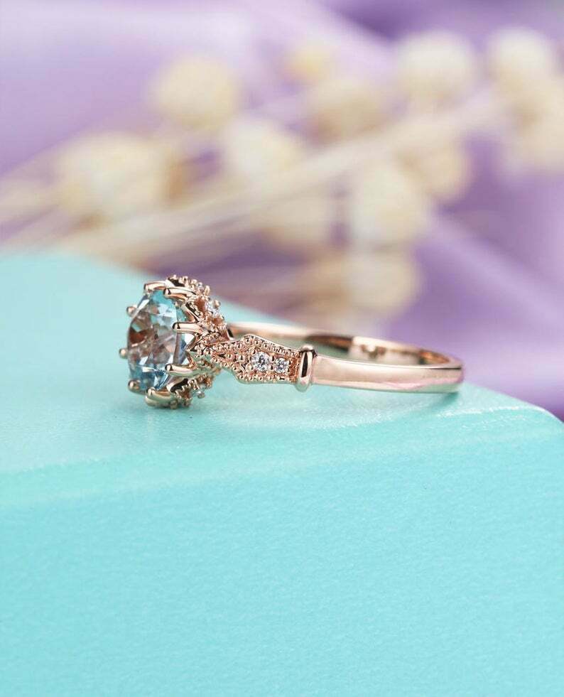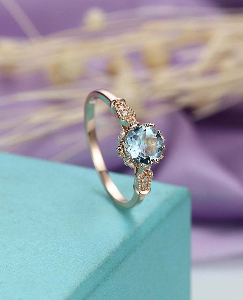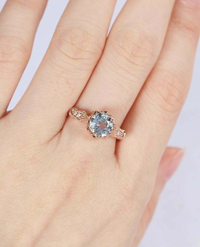 1.2ct Round Blue Aquamarine Engagement Ring Vintage Art Deco 14k Rose Gold Over