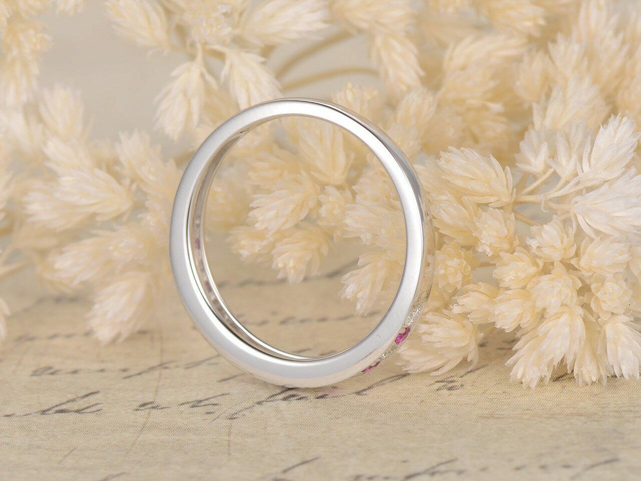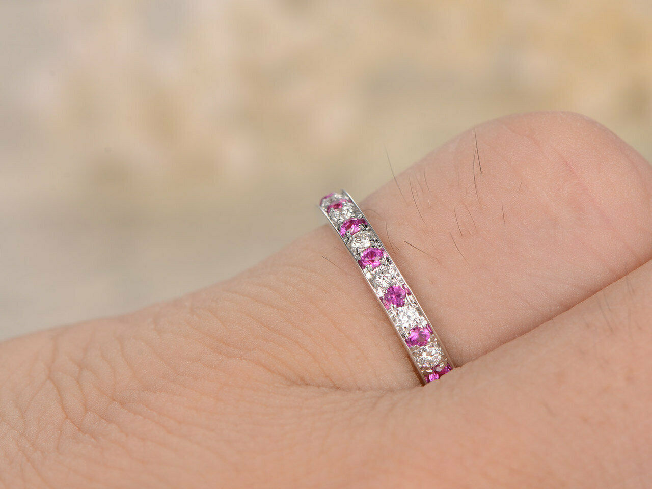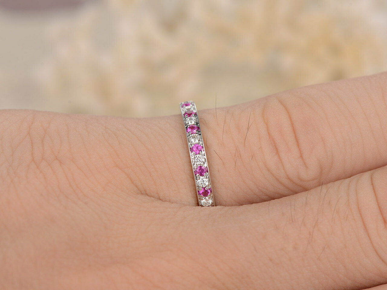 1.2ct Round Cut Pink Sapphire Wedding Band Half Eternity 14k White Gold Finish