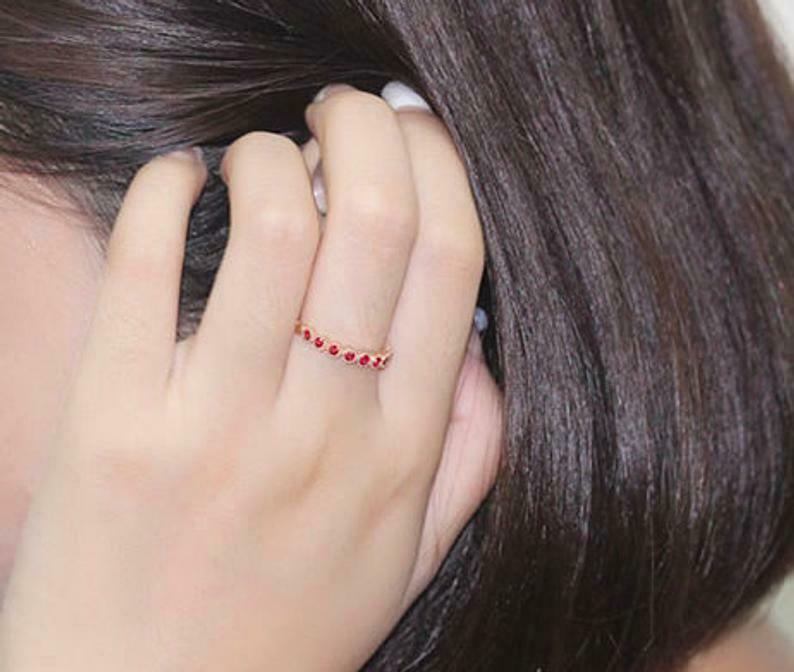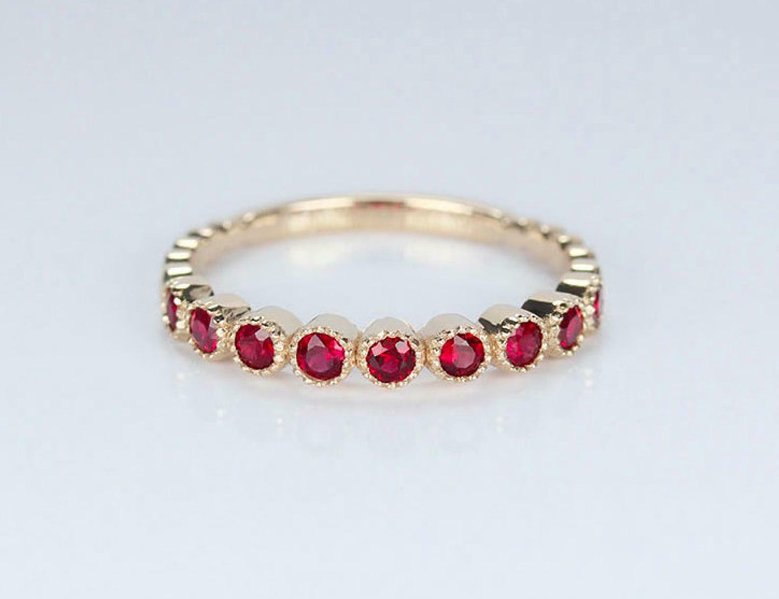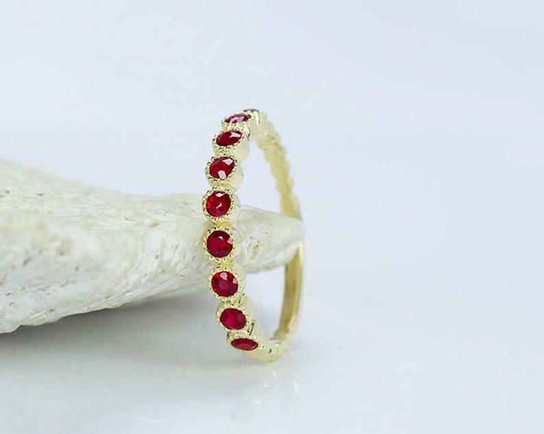 1.2ct Round Cut Pink Ruby Wedding Band Half Eternity Stackable 14k Yellow Gold Over