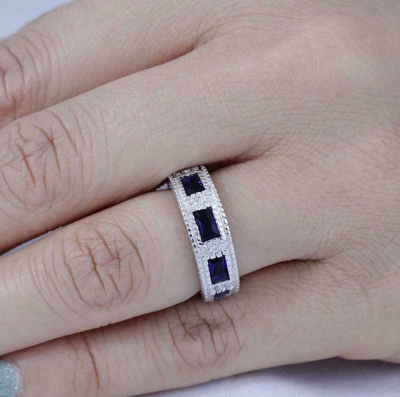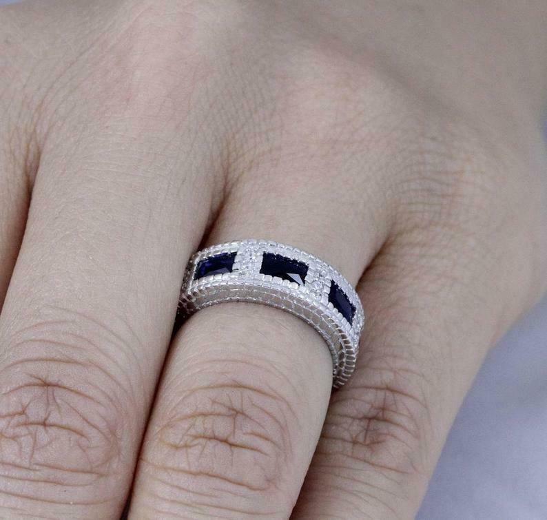 1.5ct Baguette Blue Sapphire Wedding Band Milgrain Stackable 14k White Gold Over