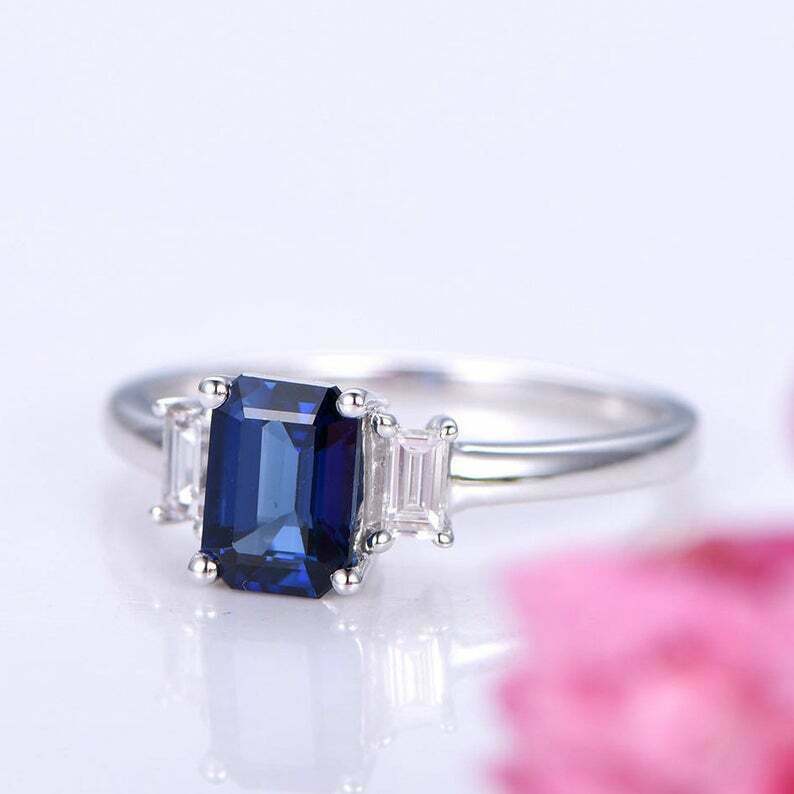 1.5ct Emerald Cut Blue Sapphire Engagement Ring Diamond Trilogy 14k White Gold Over