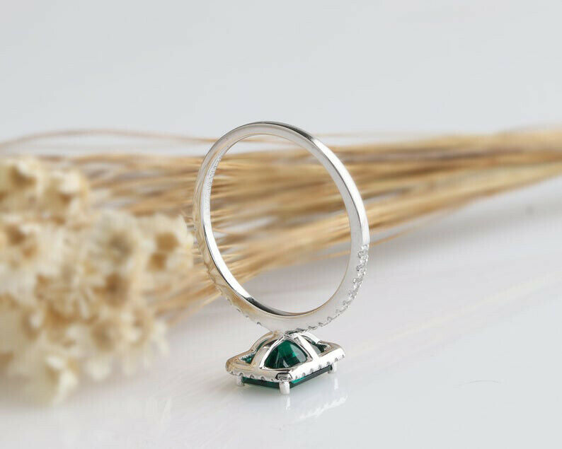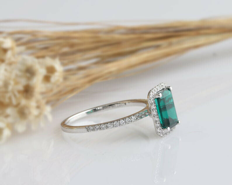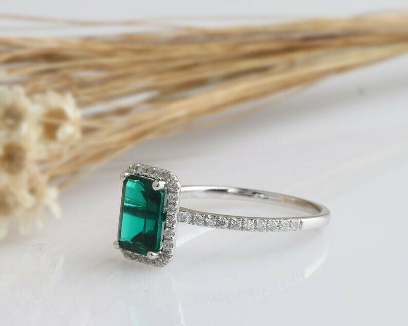 1.5ct Green Emerald Cut Halo Solitaire with Accents Ring 14k White Gold Finish