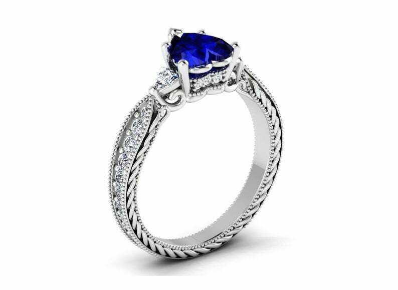 1.5ct Heart Cut Blue Sapphire Milgrain Trilogy Solitaire Ring 14k White Gold Over