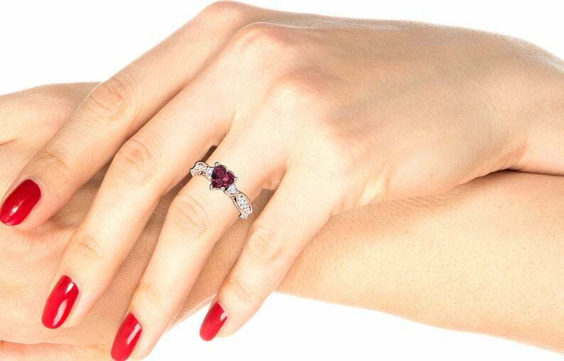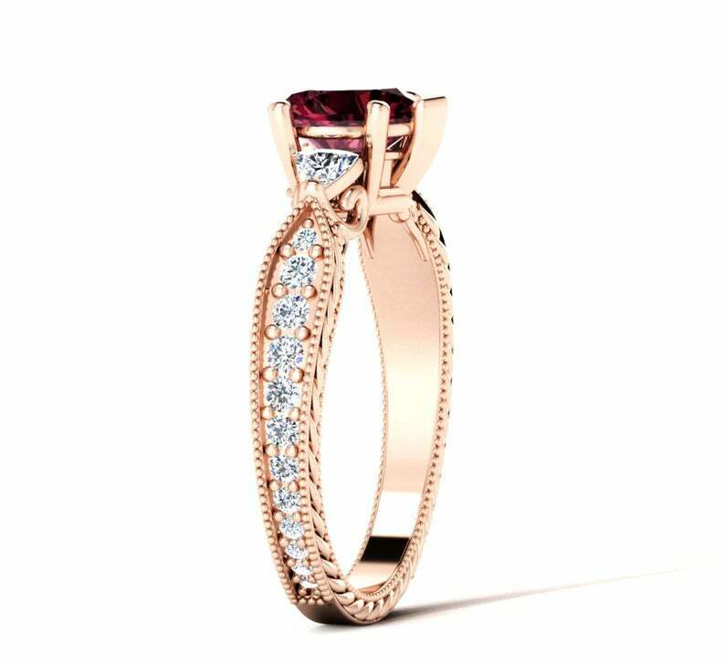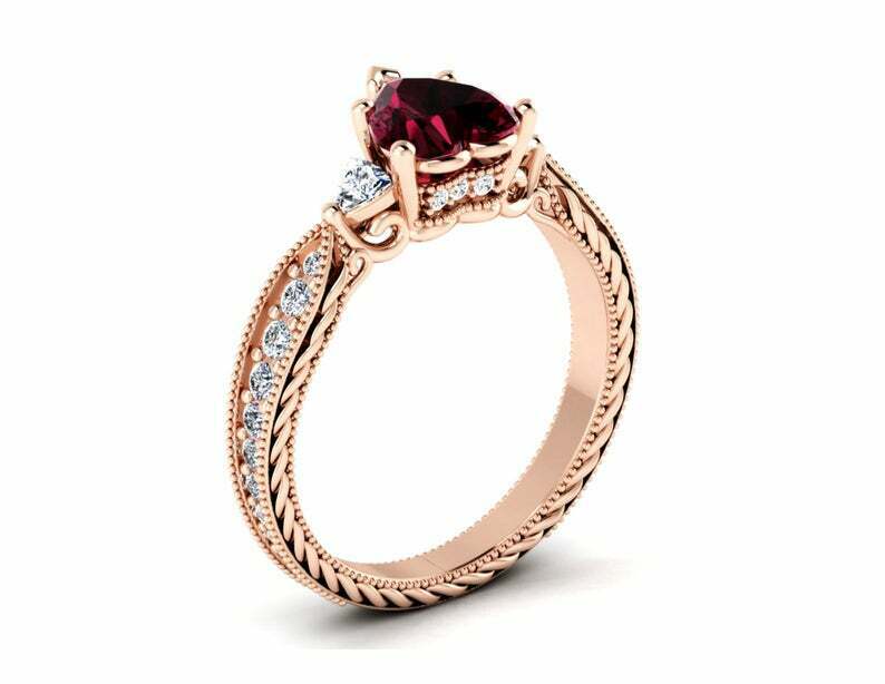 1.5ct Heart Cut Red Garnet Milgrain Trilogy Solitaire Ring 14k Rose Gold Finish