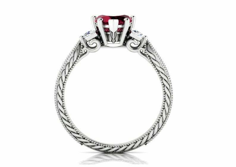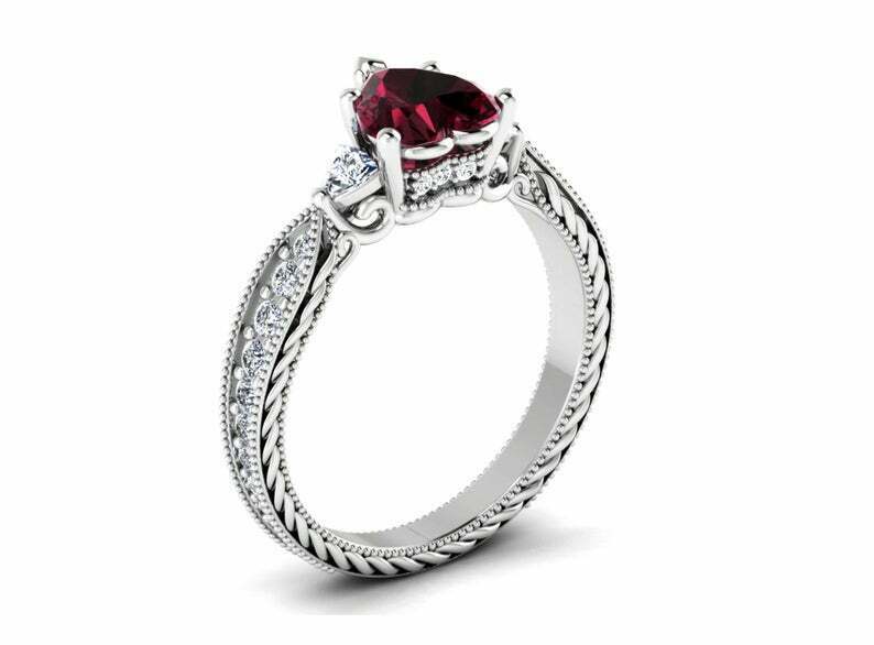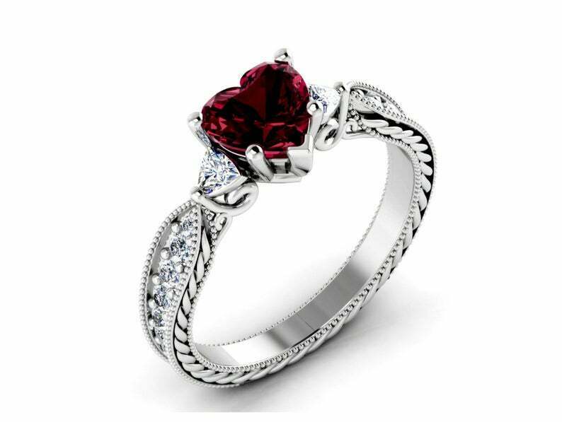 1.5ct Heart Cut Red Garnet Milgrain Trilogy Solitaire Ring 14k White Gold Finish