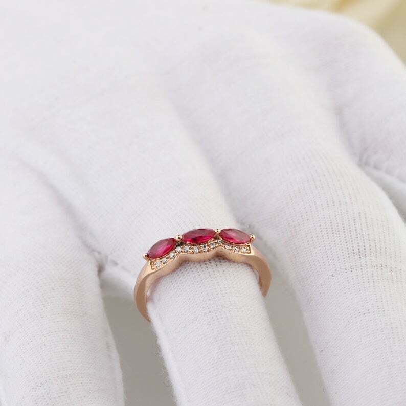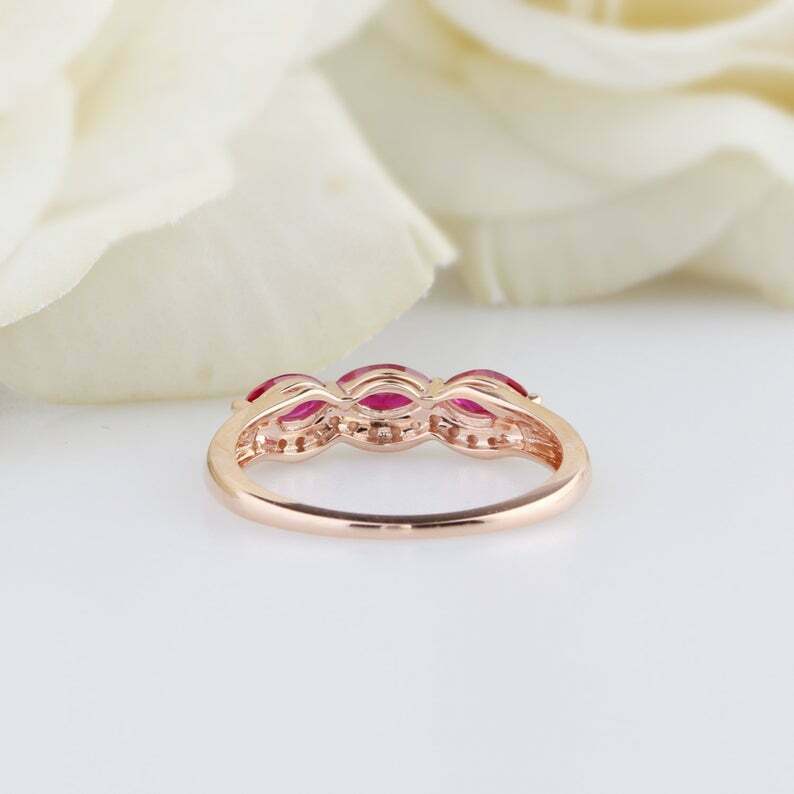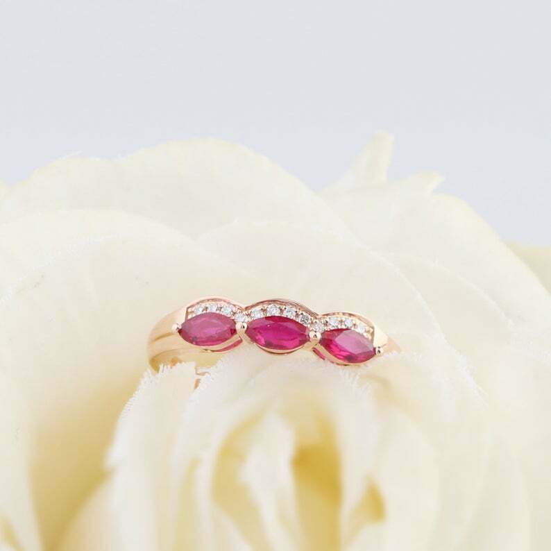 1.5ct Marquise Cut Pink Ruby Wedding Band Trilogy Halo Stackable 14k Yellow Gold Over