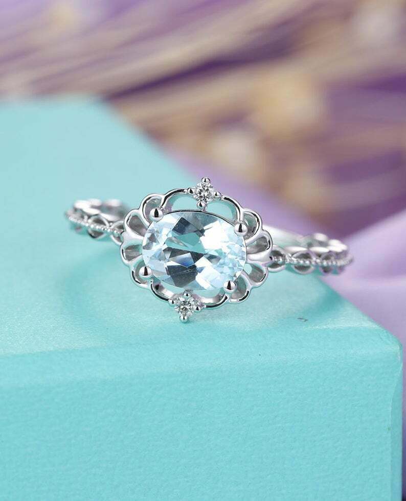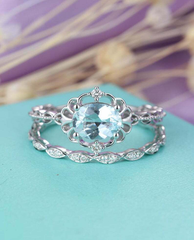 1.5ct Oval Cut Blue Aquamarine Art Deco Bridal Set Engagement Ring 14k White Gold Finish