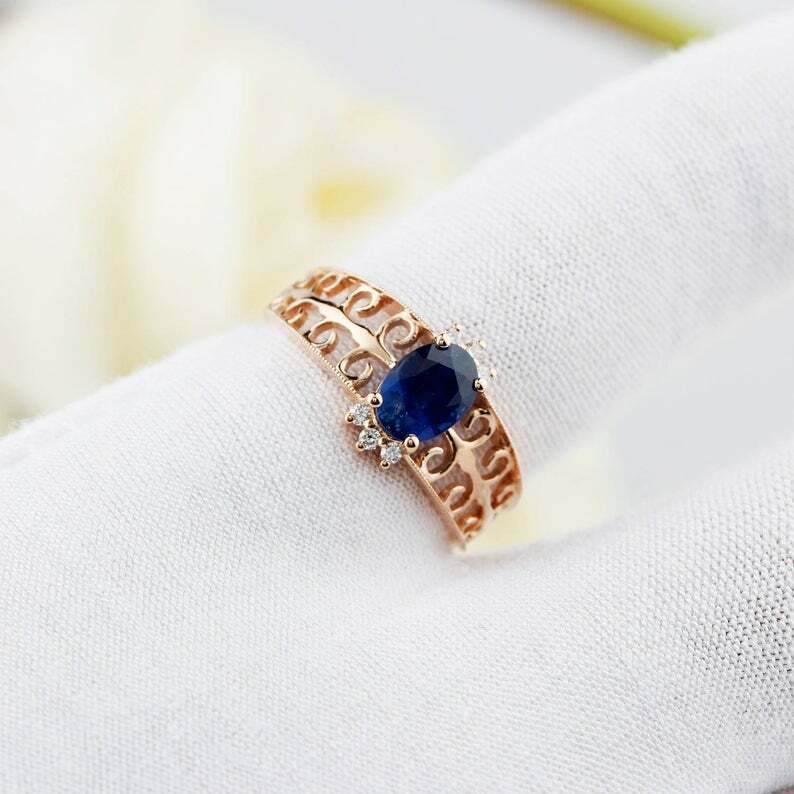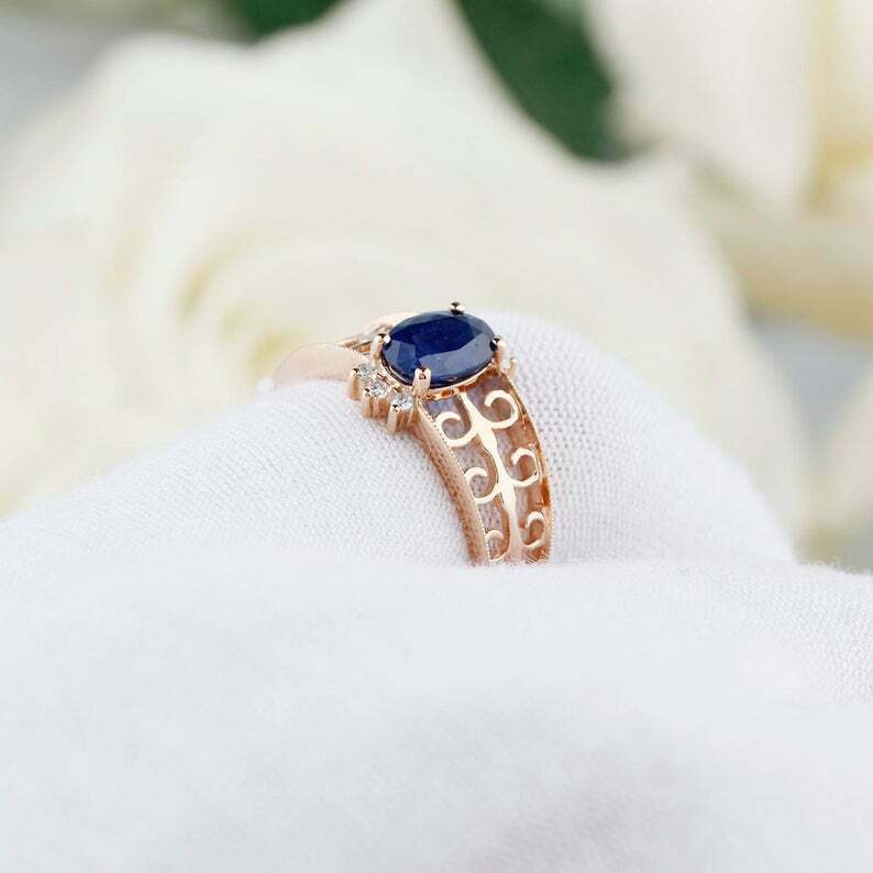 1.5ct Oval Cut Blue Sapphire Filigree Crown Open Shank Ring 14k Rose Gold Finish