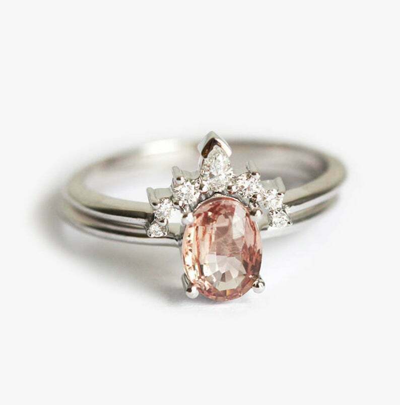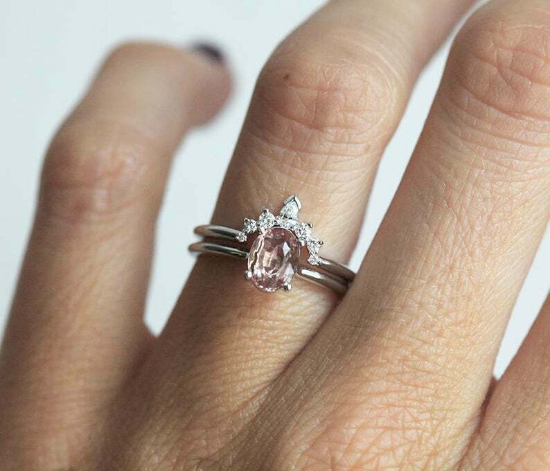 1.5ct Oval Cut Morganite Engagement Ring 14k White Gold Finish Curved Trio Set