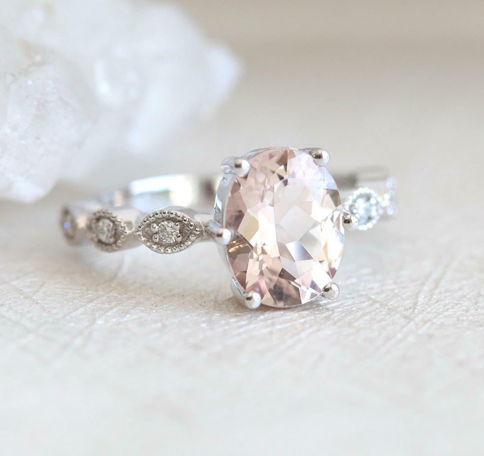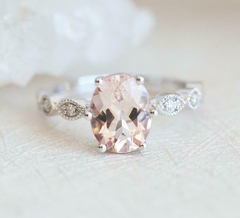 1.5ct Oval Cut Morganite Engagement Ring Diamond Accents 14k White Gold Finish