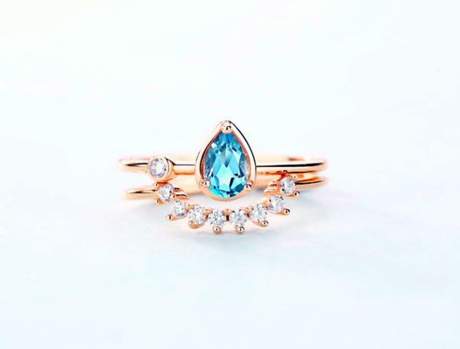 1.5ct Pear Blue Aquamarine Engagement Ring Curved Bridal Set 14k Rose Gold Over