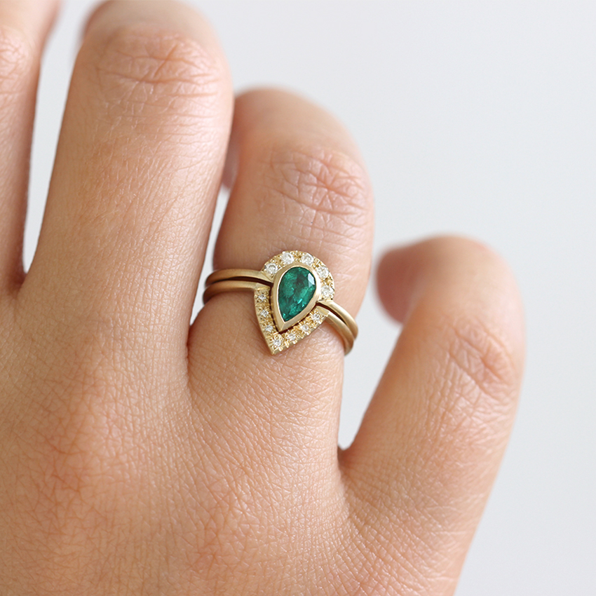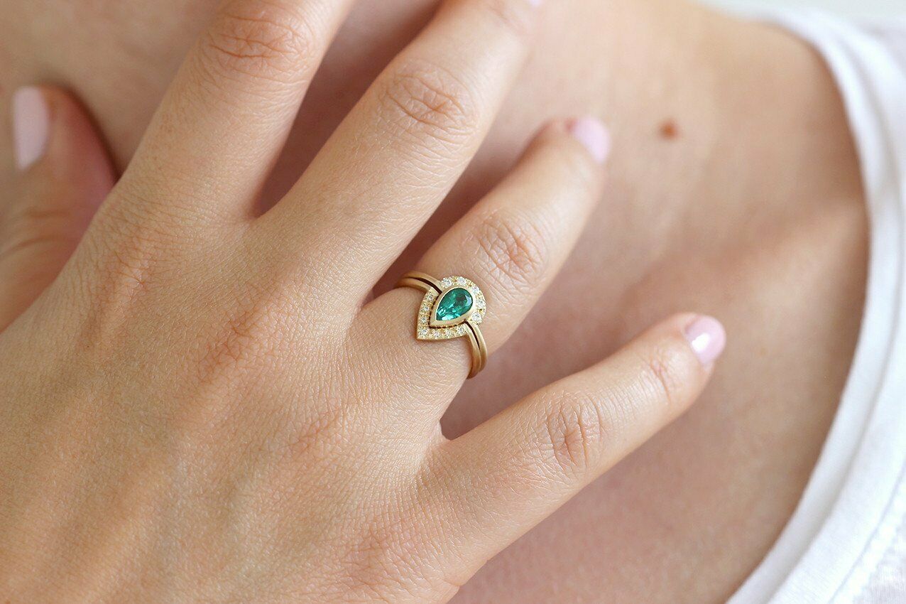 1.5ct Pear Cut Green Emerald Engagement Ring 14k Yellow Gold Finish Bridal Set