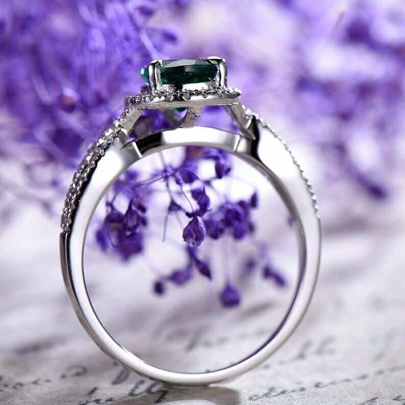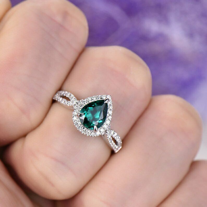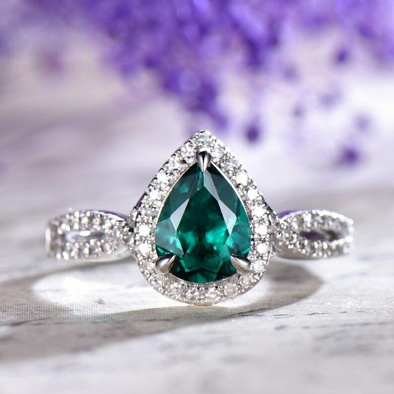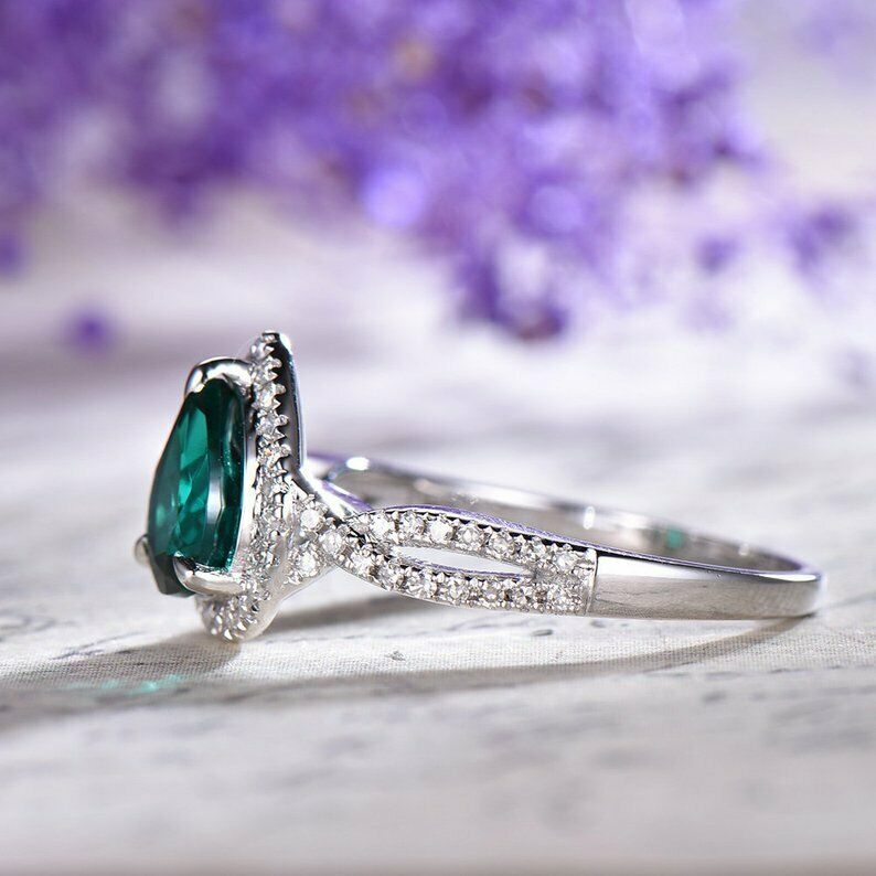 1.5ct Pear Cut Green Emerald Engagement Ring Halo Diamond 14k White Gold Finish