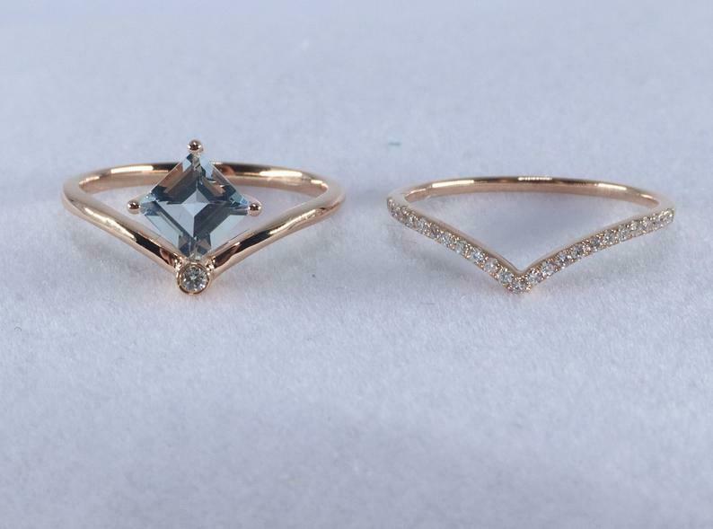 1.5ct Princess Cut Blue Aquamarine Engagement Ring Bridal Set 14k Yellow Gold Finish