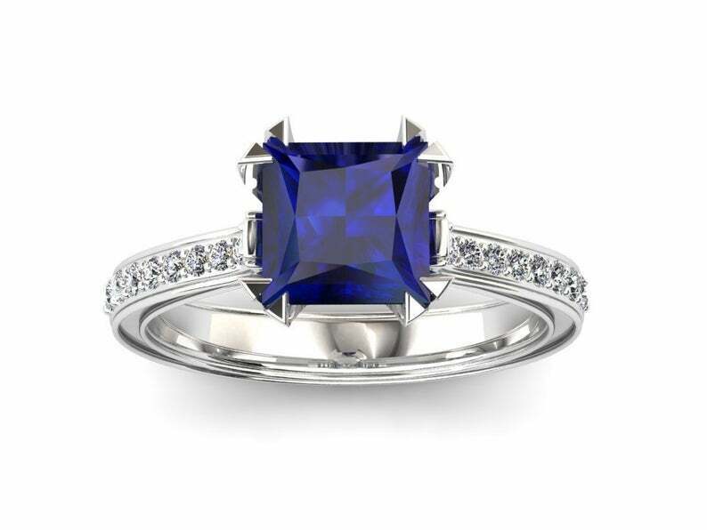 1.5ct Princess Cut Blue Sapphire Engagement Ring Dual Prong Solitaire with Accent 14k White Gold Finish