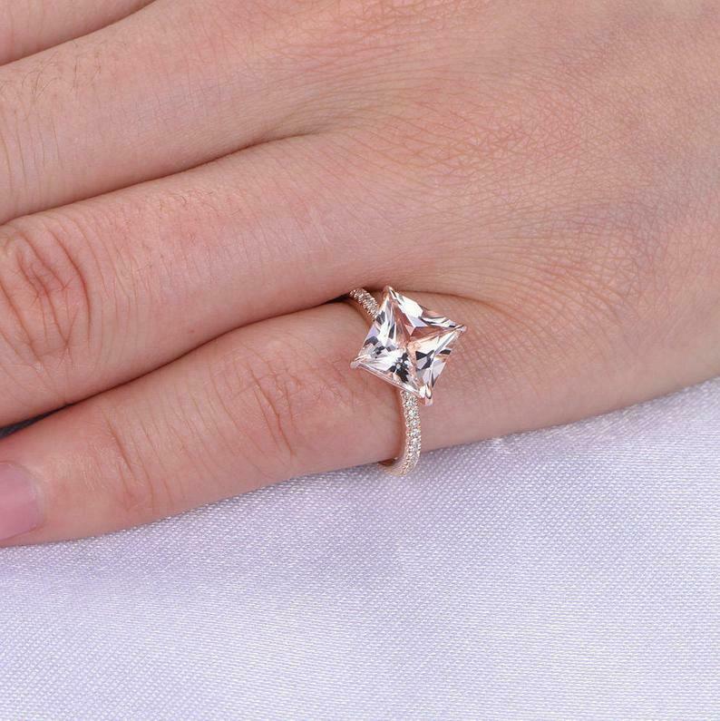 1.5ct Princess Cut Morganite Solitaire with Round Accent Ring 14k Rose Gold Over