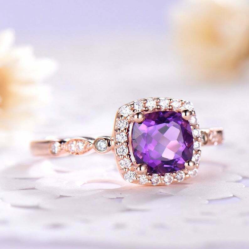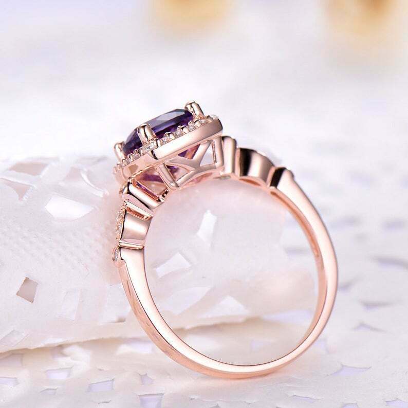 1.6ct Cushion Cut Purple Amethyst Engagement Ring Solitaire Halo 14k Rose Gold Over