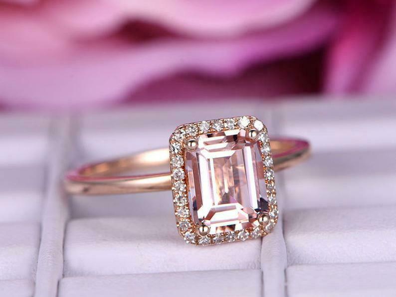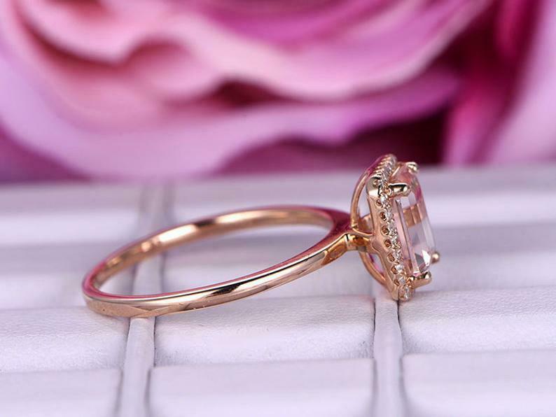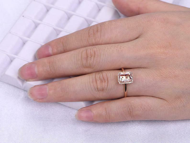 1.6ct Emerald Cut Peach Morganite Diamond Halo Solitaire Ring 14k Rose Gold Over