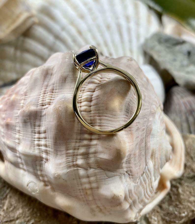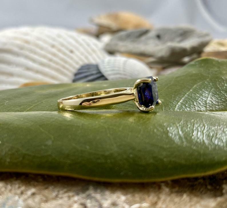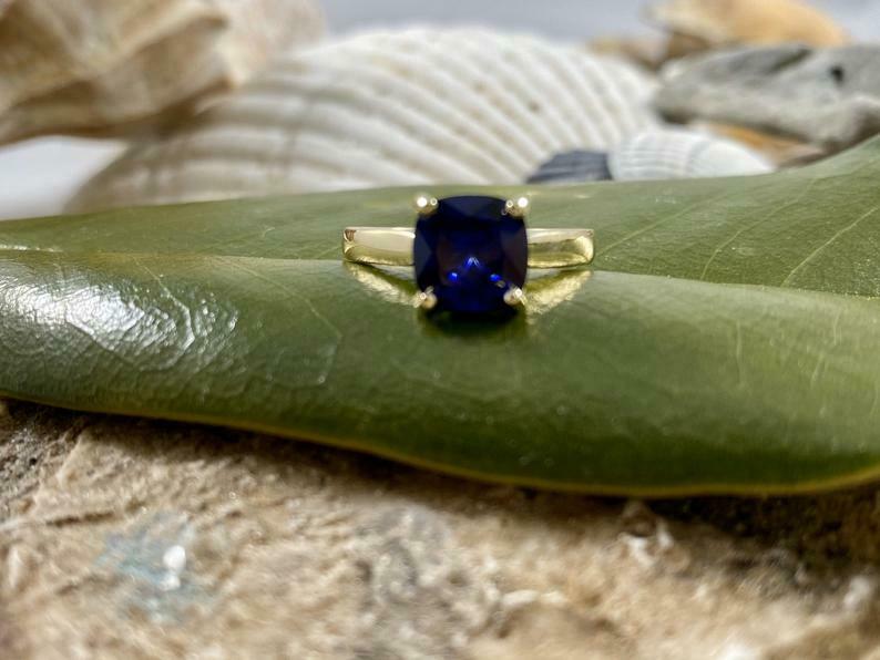 1.6ct Engagement Ring Cushion Cut Blue Sapphire Solitaire 14k Yellow Gold Finish