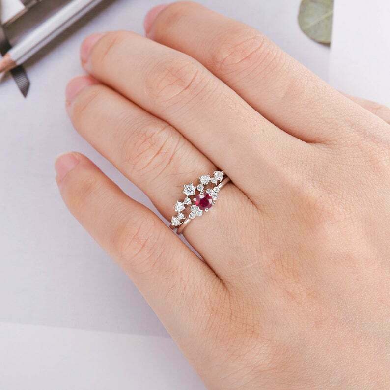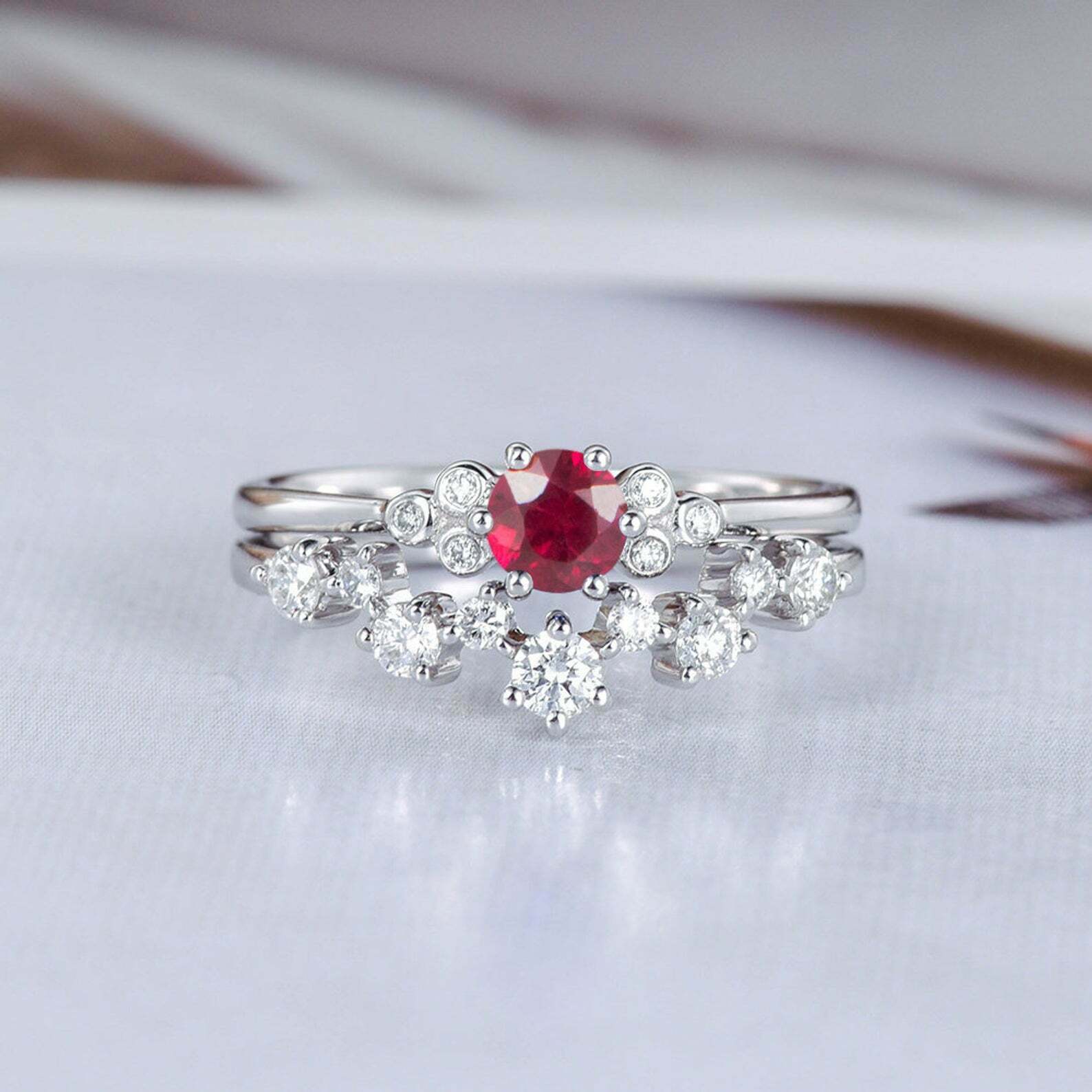 1.6ct Round Cut Pink Ruby Bridal Set Band Engagement Ring 14k White Gold Finish