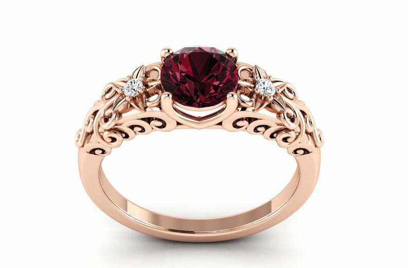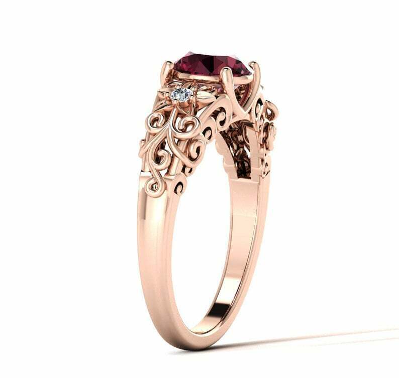 1.6ct Round Cut Red Garnet Floral Filigree Solitaire Engagement Ring 14k Rose Gold Finish