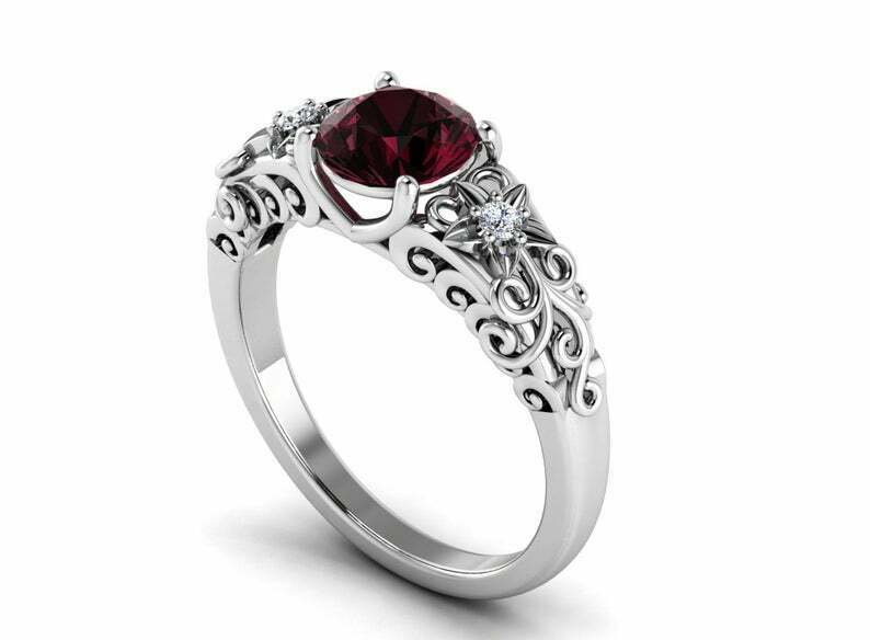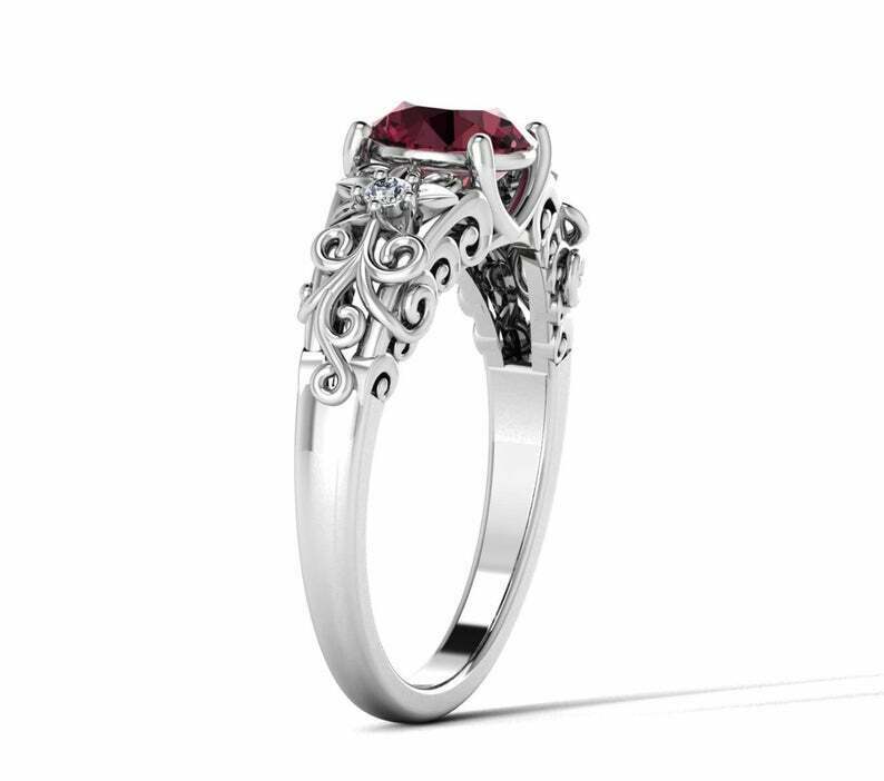 1.6ct Round Cut Red Garnet Floral Filigree Solitaire Engagement Ring 14k White Gold Finish