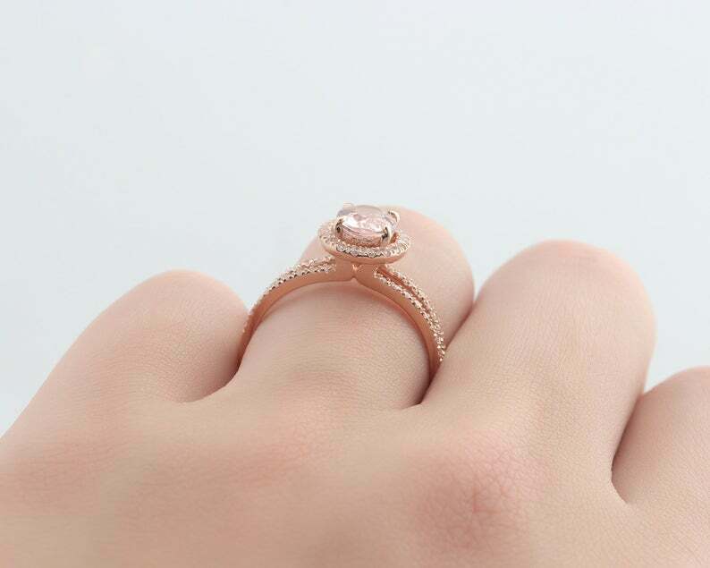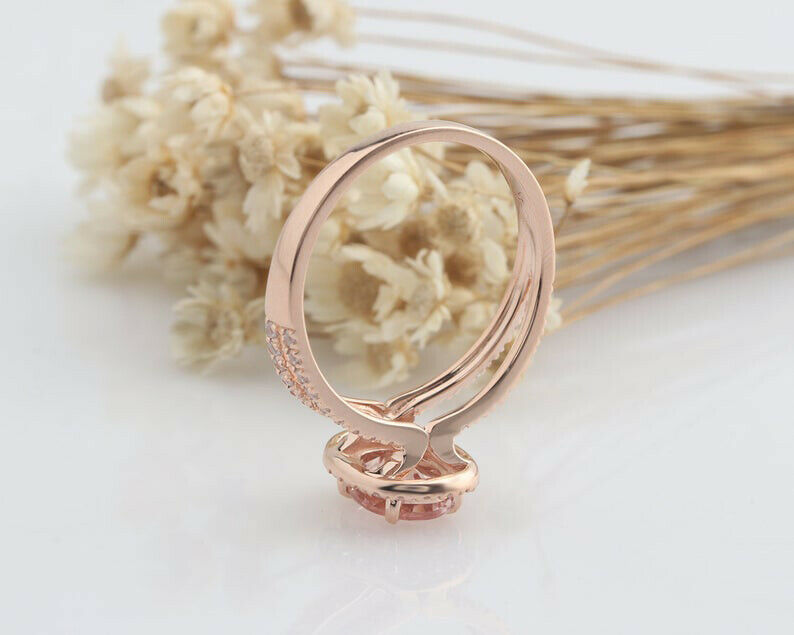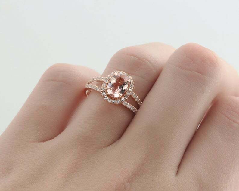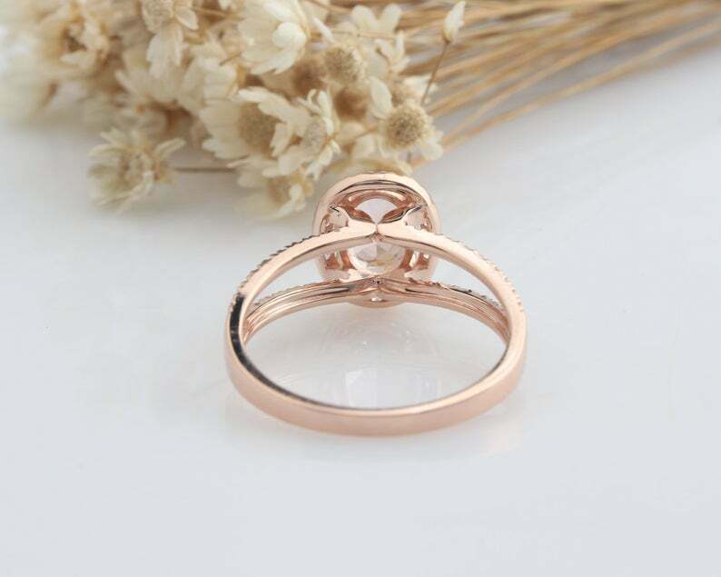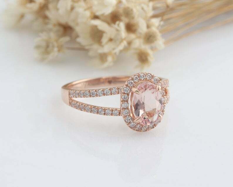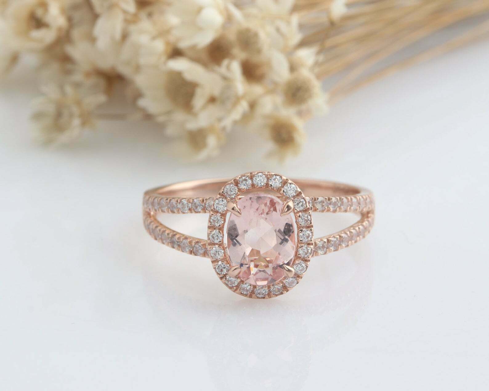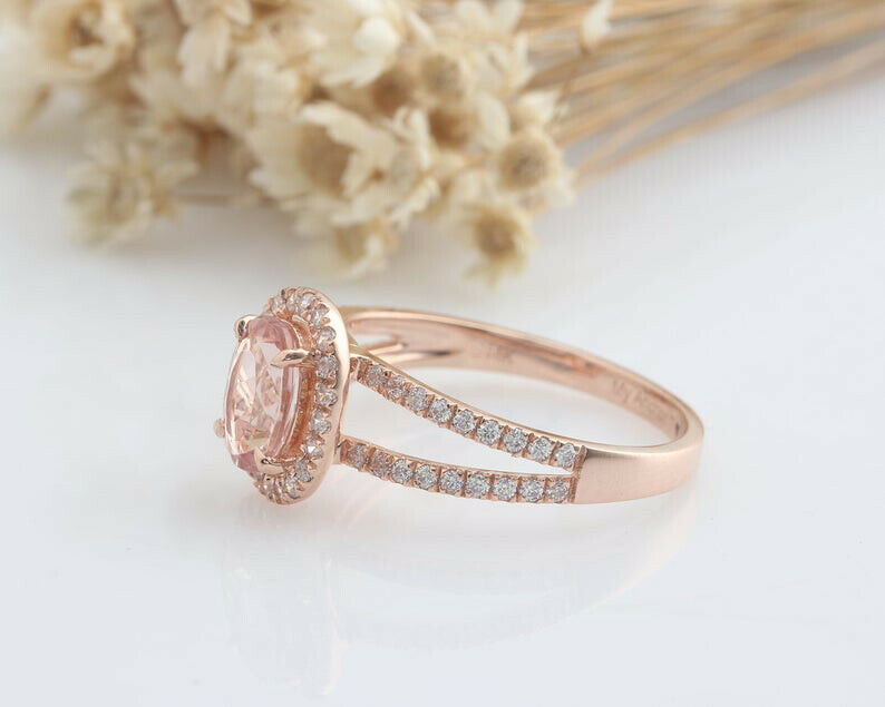 1.7ct Oval Peach Morganite Engagement Ring Split Shank Halo 14k Rose Gold Finish