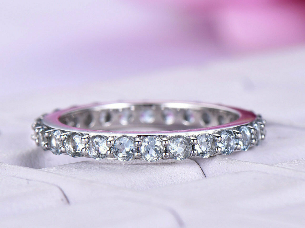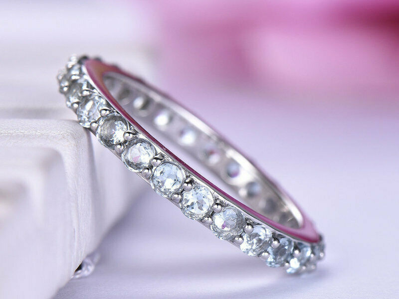1.7ct Round Cut Blue Aquamarine Wedding Band Full Eternity 14k White Gold Finish
