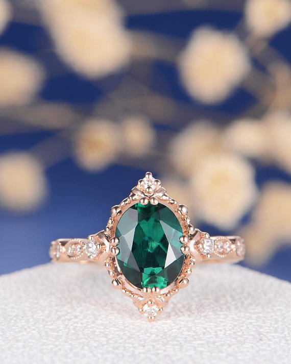 1.8ct Oval Cut Green Emerald Engagement Ring Unique Art Deco 14k Rose Gold Finish