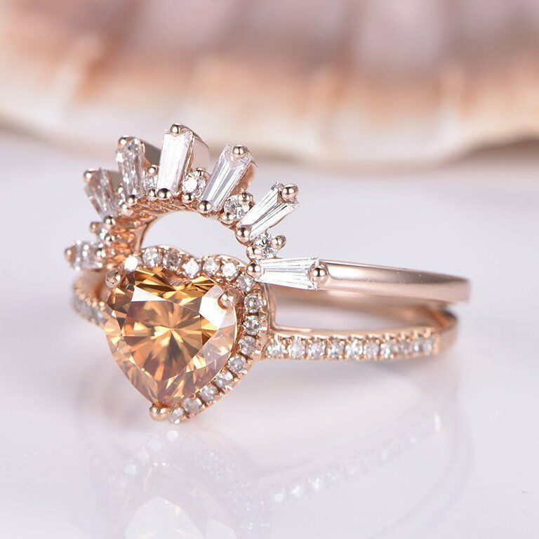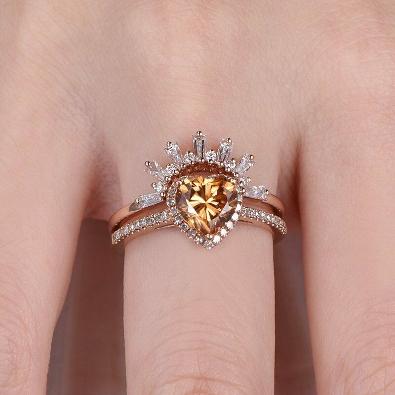 1.9ct Heart Yellow Citrine Halo Bridal Set Engagement Ring 14k Rose Gold Finish