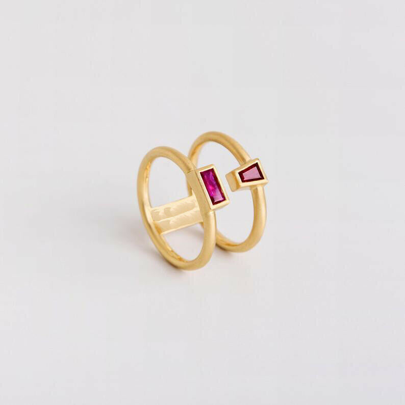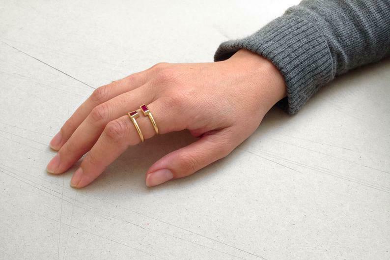 1ct Baguette Cut Pink Ruby Split Band Dual Engagement Ring 14k Yellow Gold Finish