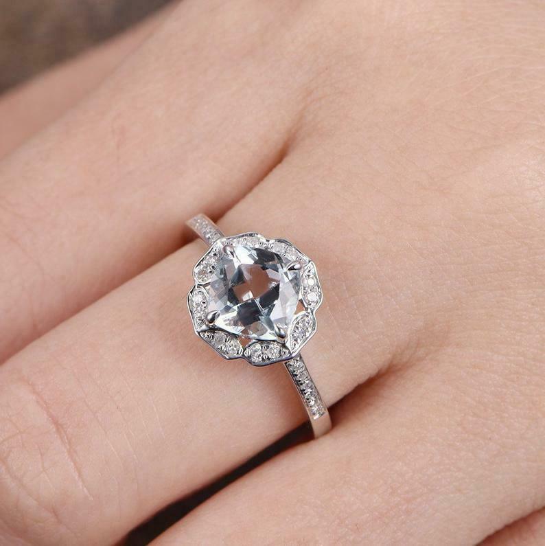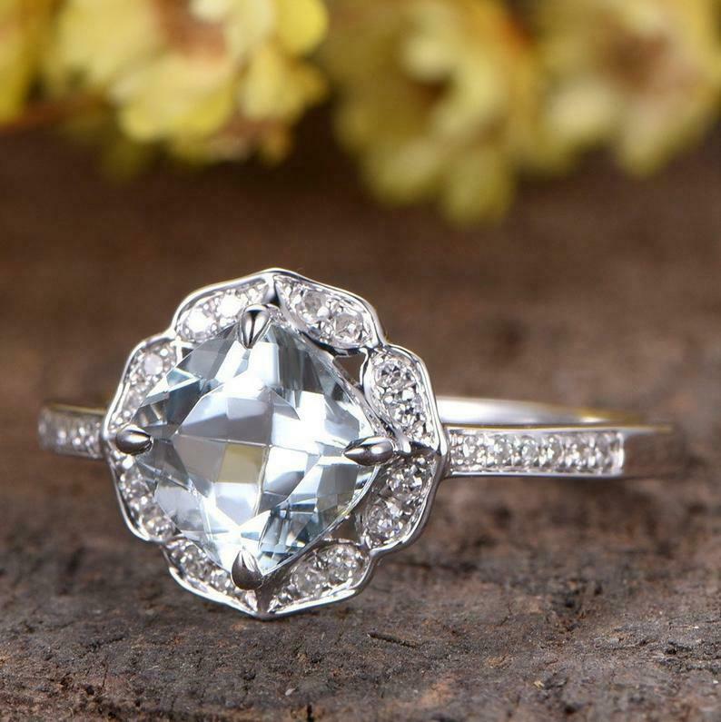 1ct Cushion Cut Blue Aquamarine Engagement Ring Solitaire Floral 14k White Gold Over