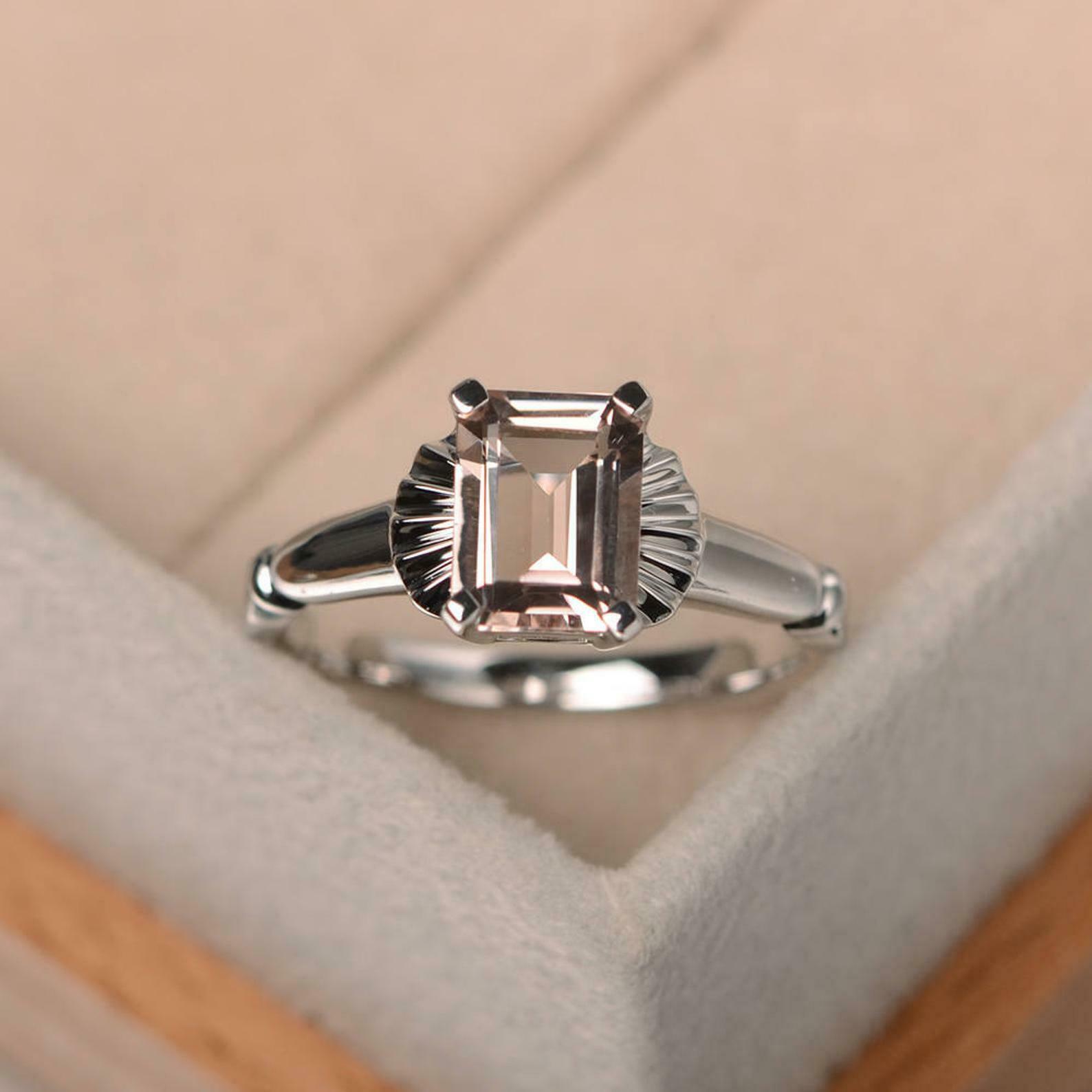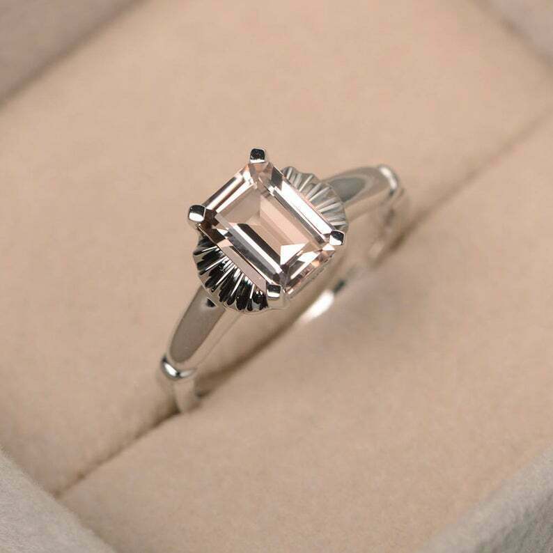 1ct Emerald Cut Peach Morganite Engagement Ring Flower Solitaire 14k White Gold Finish
