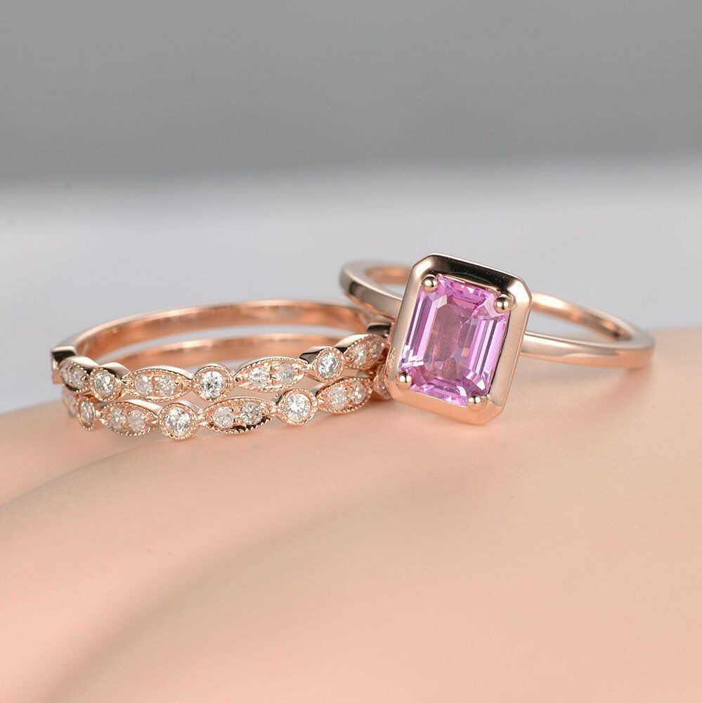 1ct Emerald Pink Sapphire Trio Set Promise Engagement Ring 14k Rose Gold Finish