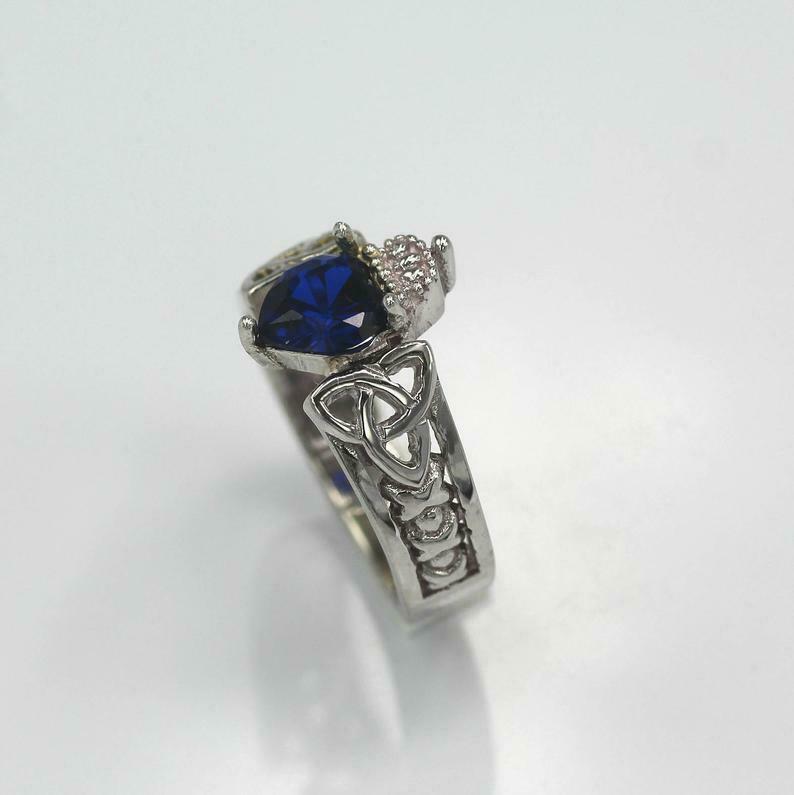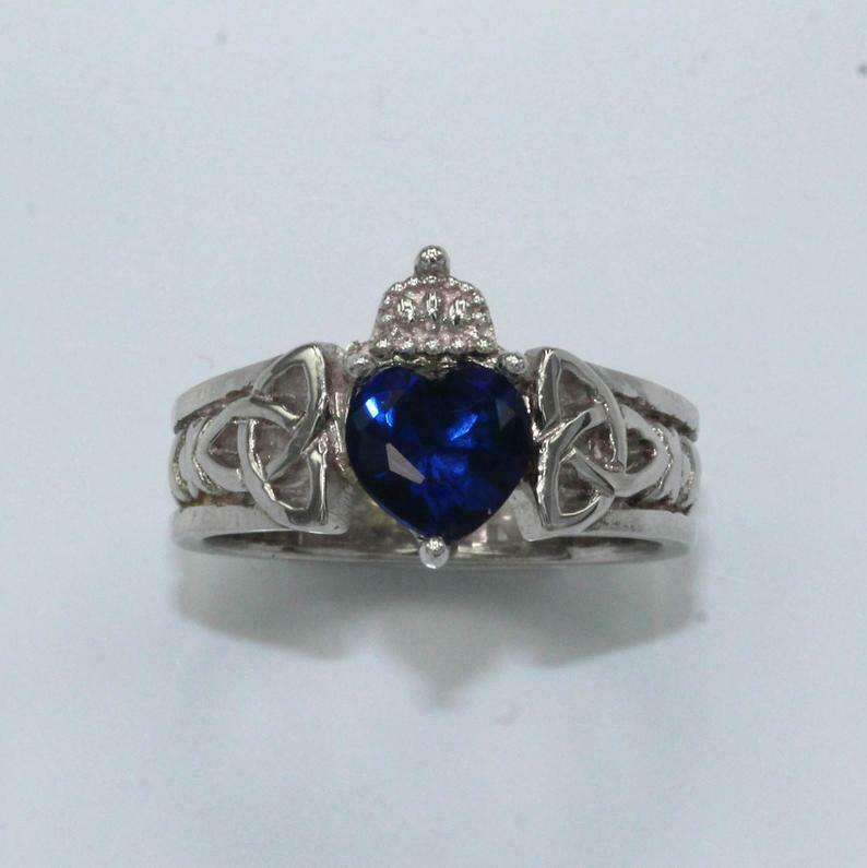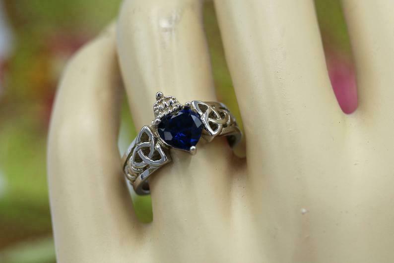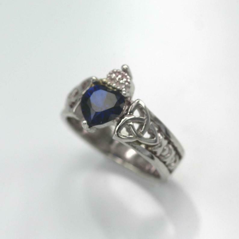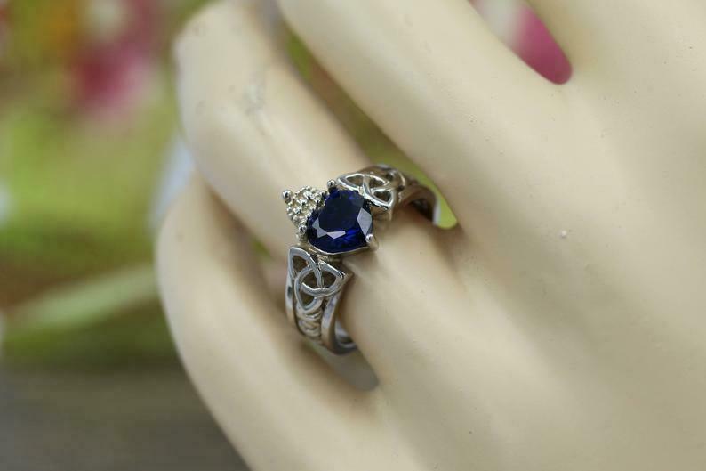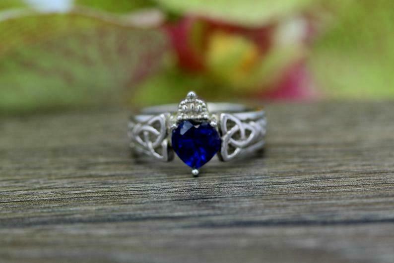 1ct Heart Cut Blue Sapphire Engagement Ring Celtic Trinity 14k White Gold Finish