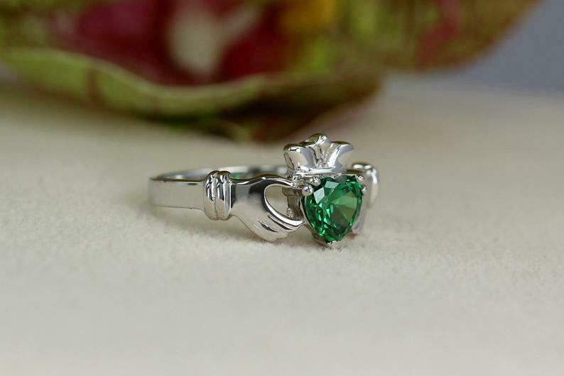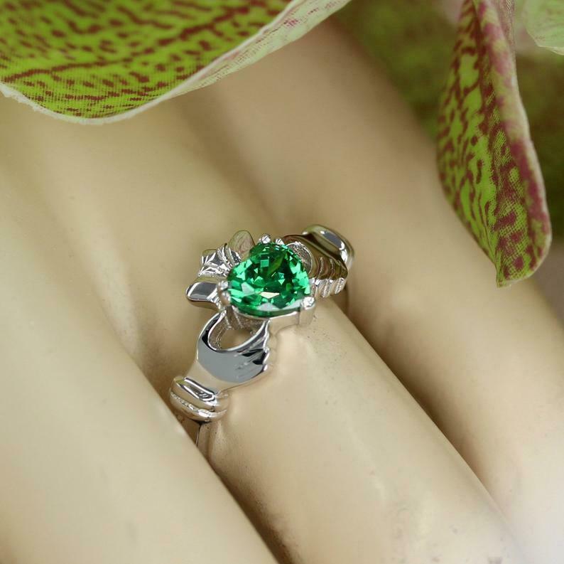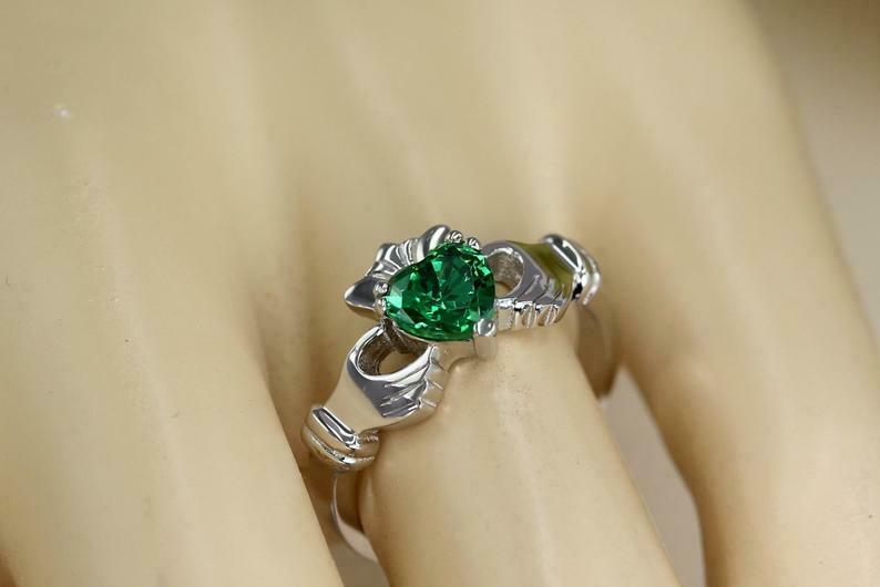 1ct Heart Cut Green Emerald Engagement Ring Claddagh Design 14k White Gold Over