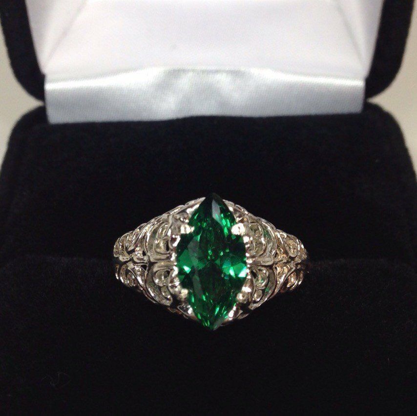 1ct Marquise Cut Green Emerald Wide Filigree Engagement Ring 14k White Gold Over