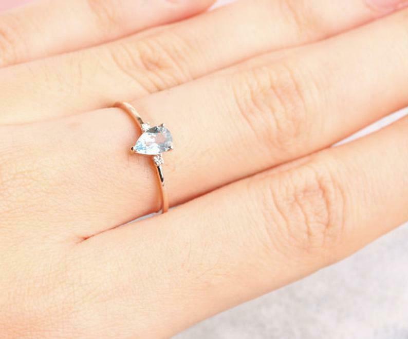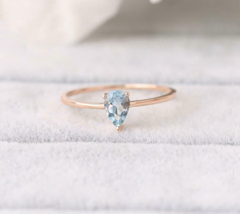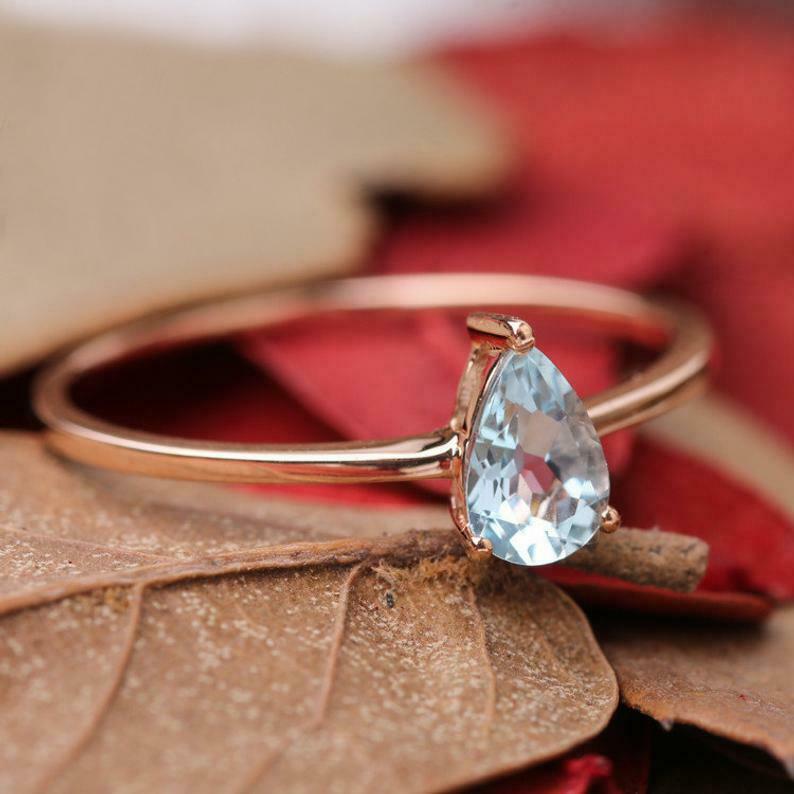 1ct Pear Blue Aquamarine Engagement Ring Solitaire Minimalist 14k Rose Gold Over