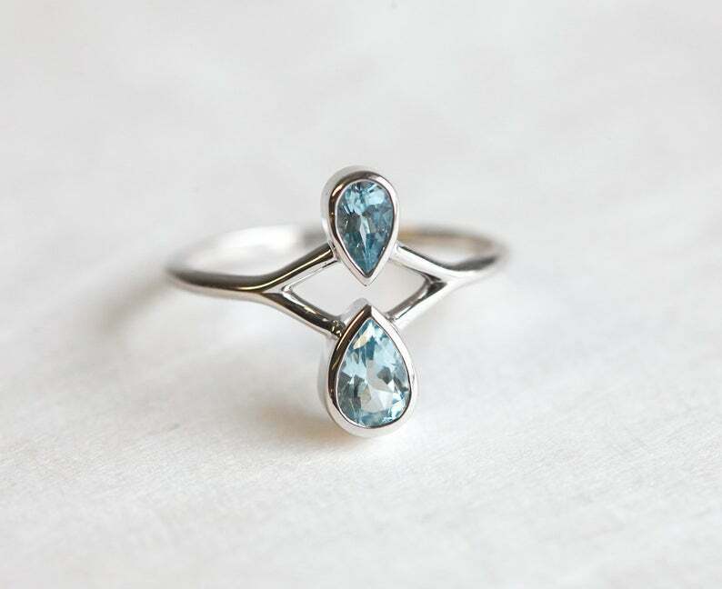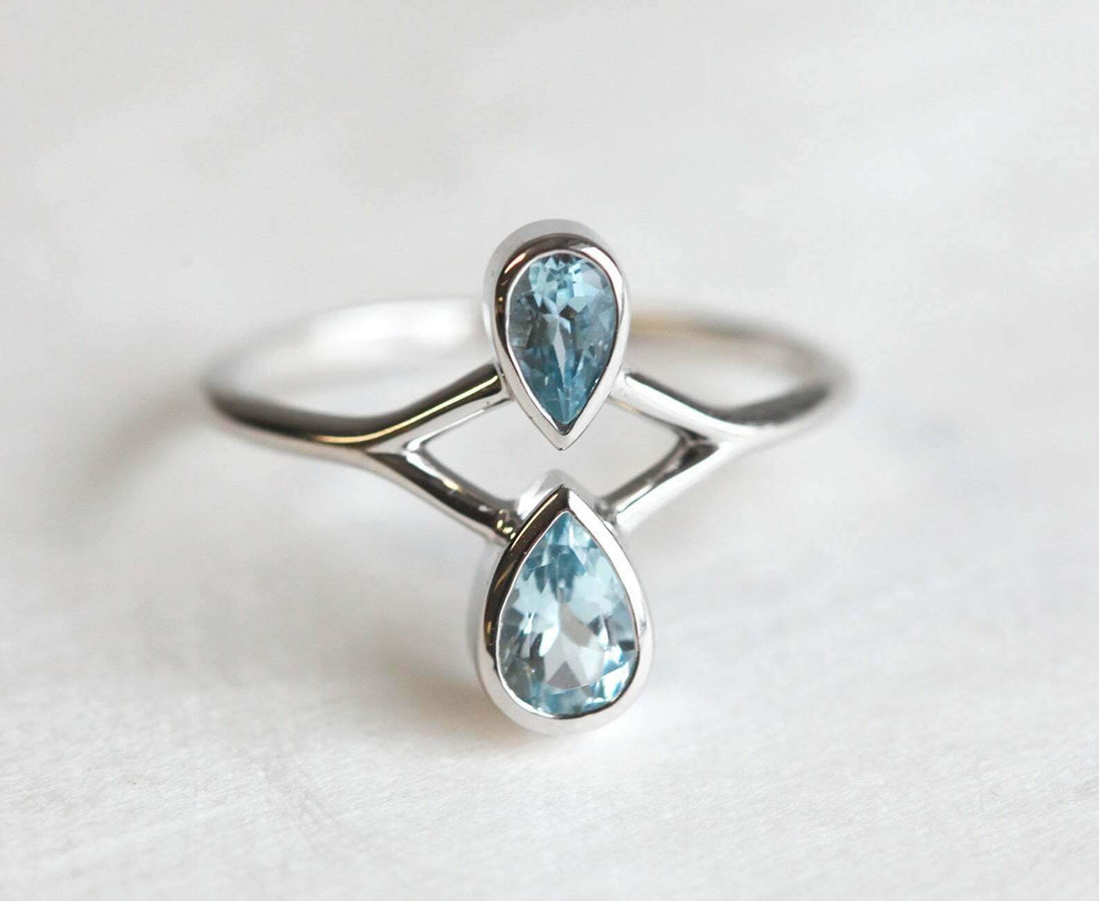 1ct Pear Blue Aquamarine Stylish Two Stone Split Shank Ring 14k White Gold Over