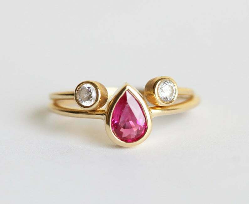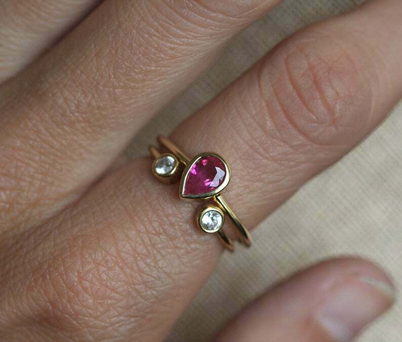 1ct Pear Cut Pink Ruby Engagement Ring 14k Yellow Gold Over Round Accent Trilogy