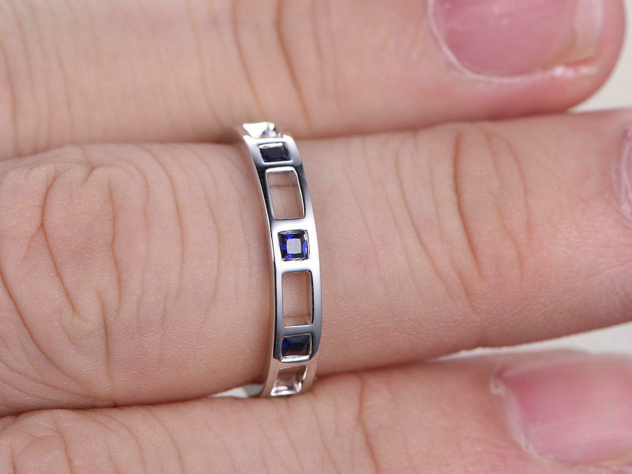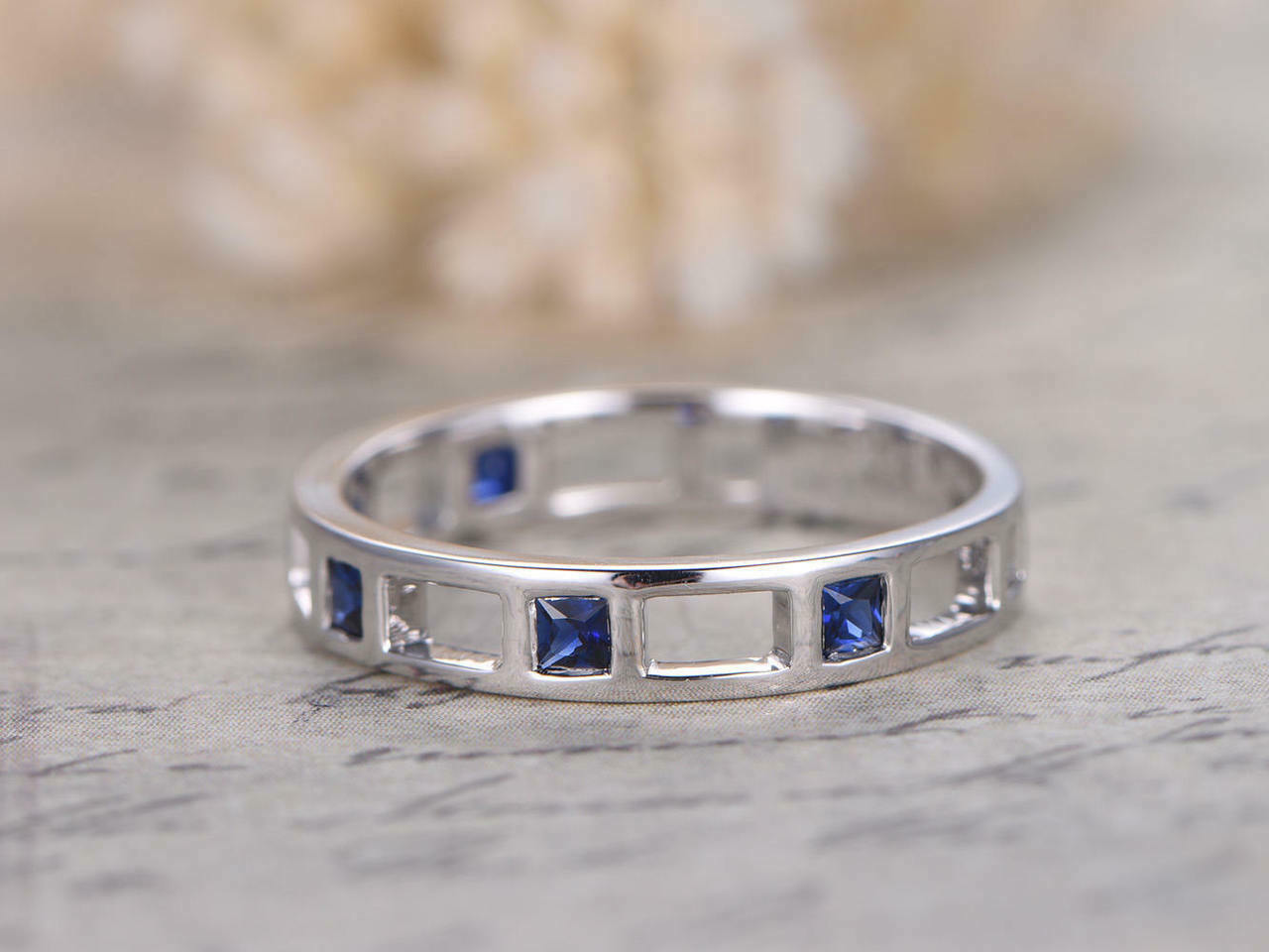 1ct Princess Cut Blue Sapphire Wedding Band Open Gaps Eternity 14k White Gold Finish