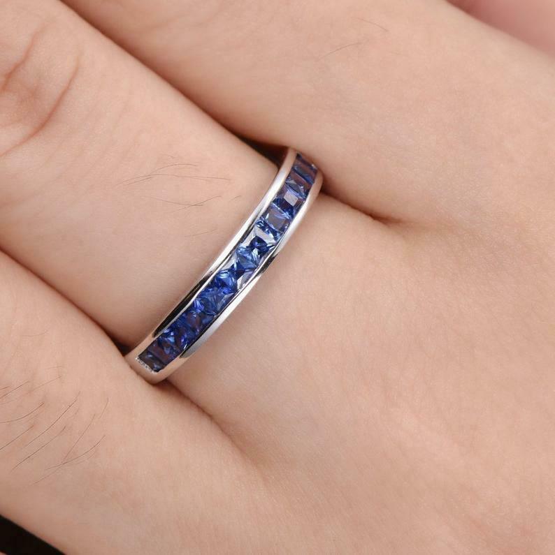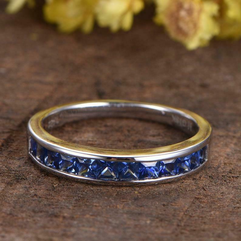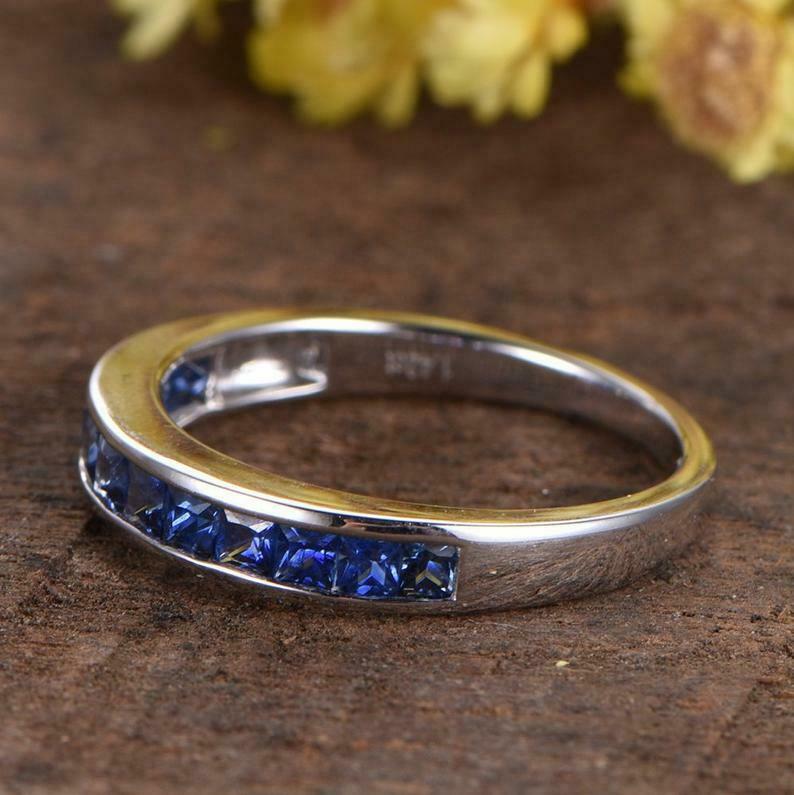 1ct Princess Cut Blue Sapphire Channel Set Half Eternity Band 14k WhiteGold Over