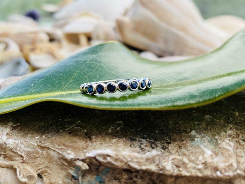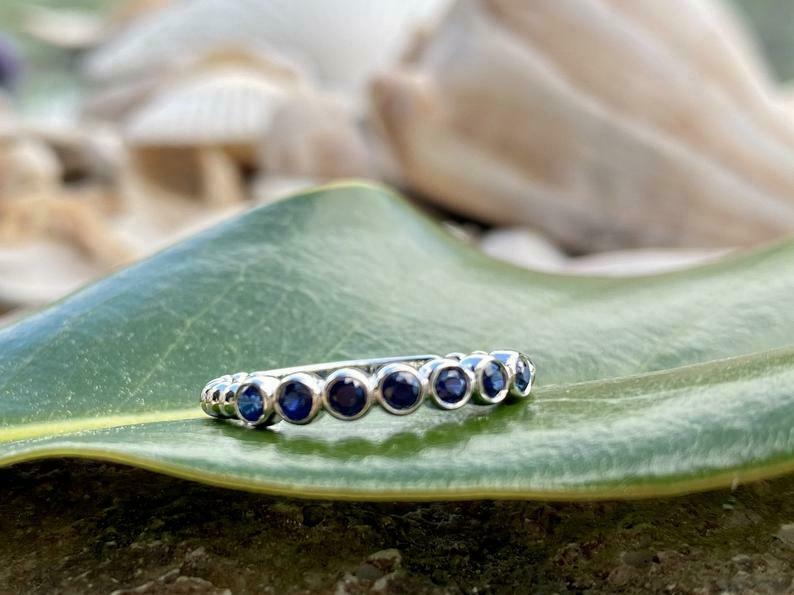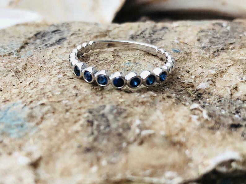 1ct Round Cut Blue Sapphire Beaded Ball Shank Solitaire Band 14k White Gold Over