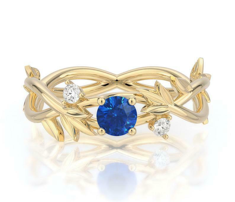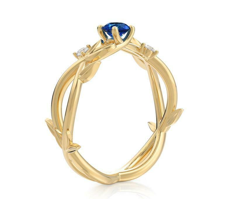 1ct Round Cut Blue Sapphire Leaf Solitaire Engagement Ring 14k Yellow Gold Finish