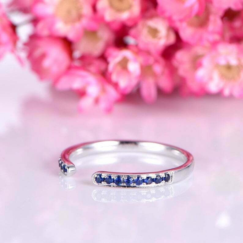 1ct Round Cut Blue Sapphire Wedding Ring Band Open Stackable 14k White Gold Over